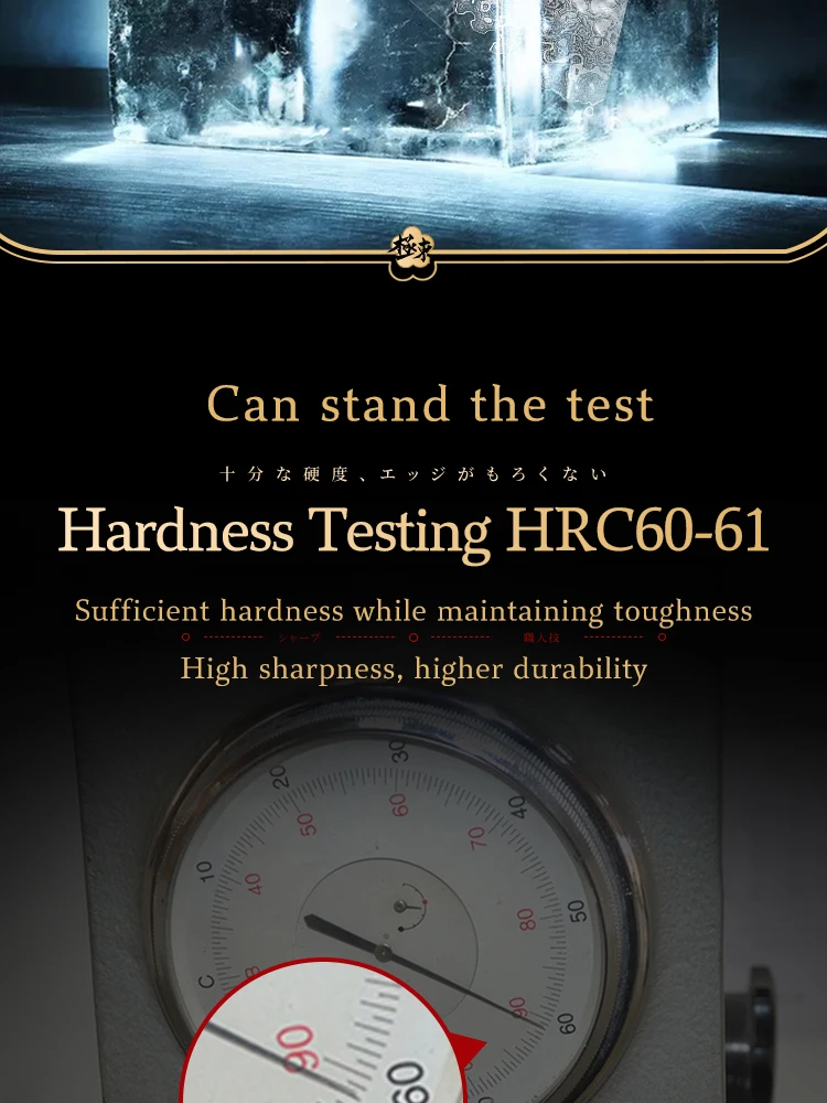 3: твердость стального сердечника кухонного ножа HRC60 ± 1. Высококачественная сталь может обеспечить стабильность твердости продукта и повысить долговечность.