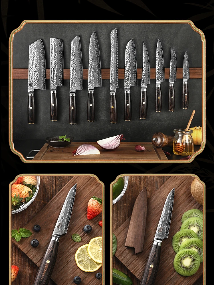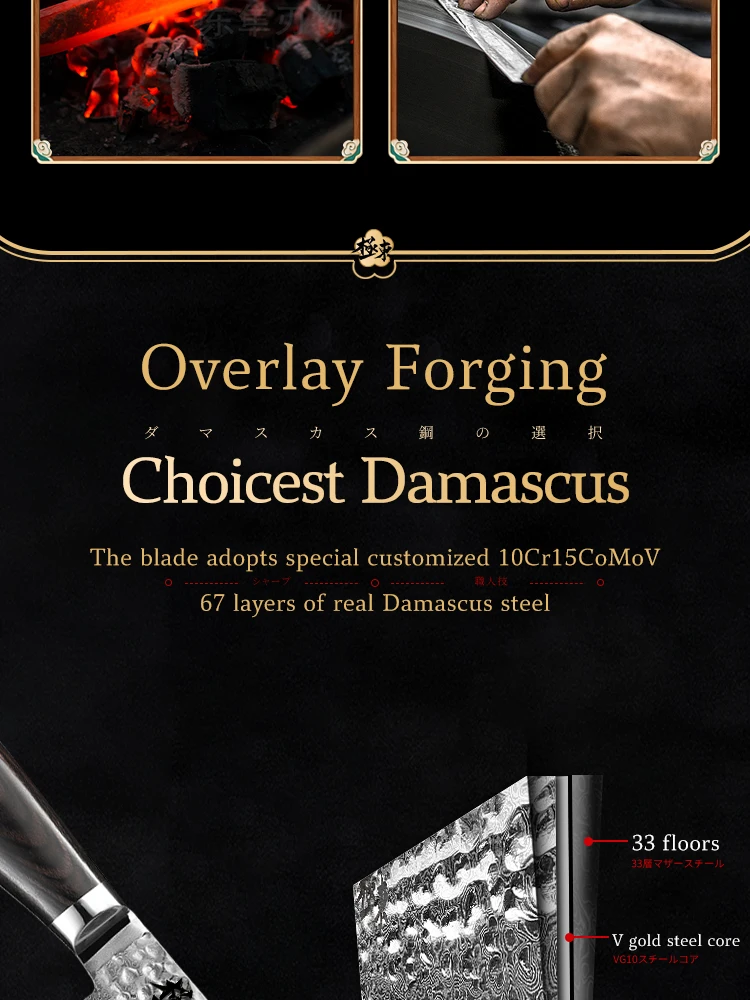 1: продукт использует V-gold 67 слоев Дамаска. Высокоэффективная сталь обеспечивает твердость, твердость, остроту и долговечность кухонного ножа.