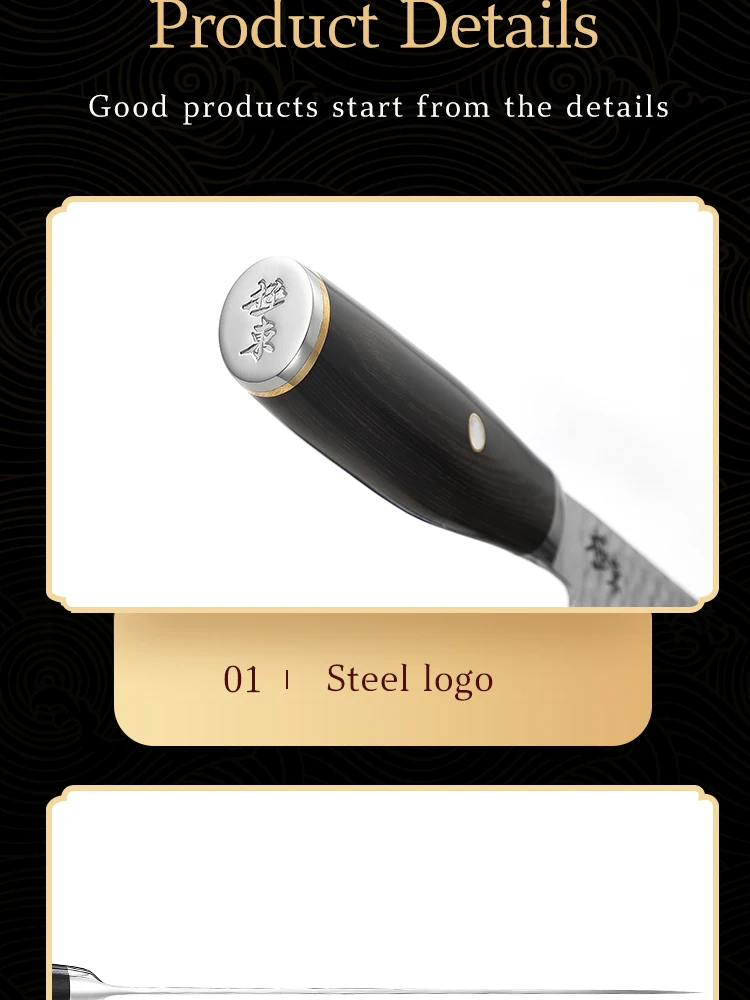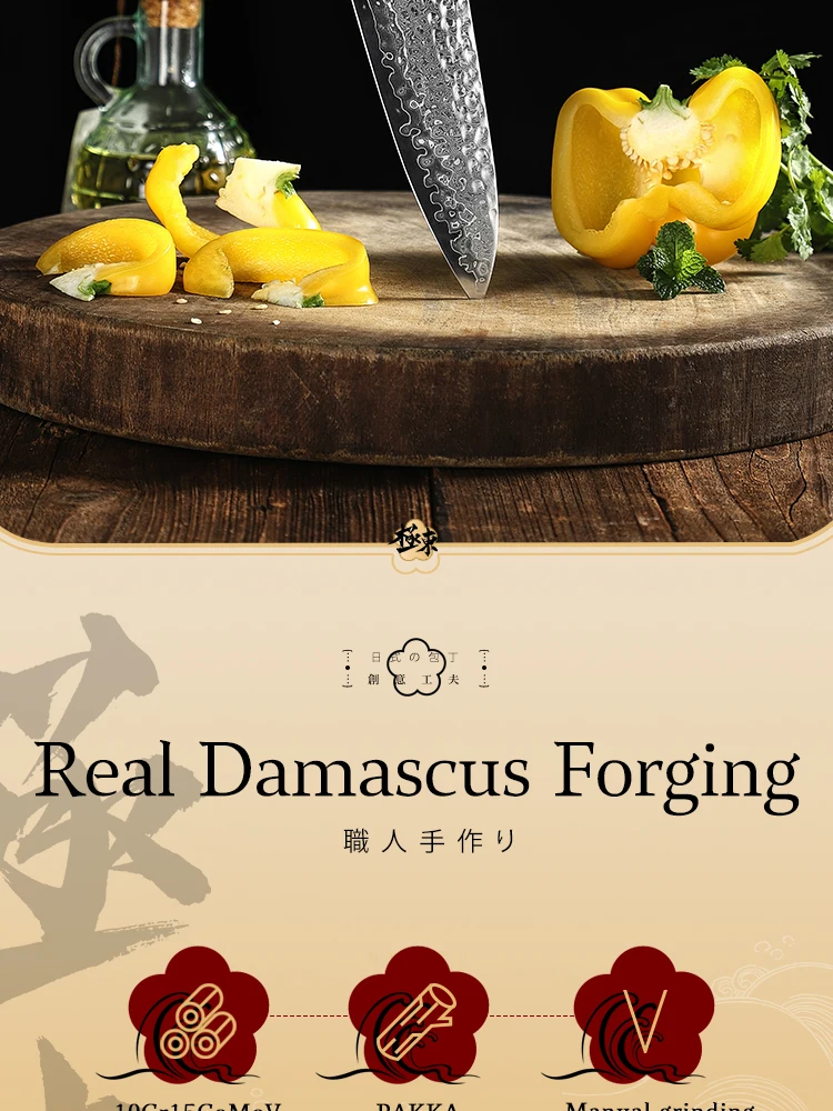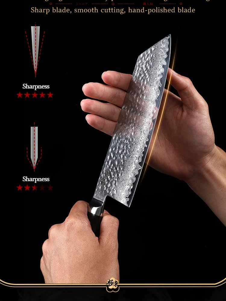 1: В продукте используется V-Gold 67 слоев Дамаска. Высококачественная сталь может обеспечить твердость, прочность, остроту и долговечность кухонного ножа.