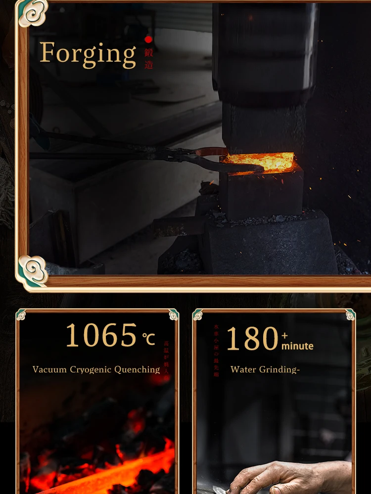 4: Изделие выковано из стали толщиной 3,5 мм. После нескольких процессов ковки лезвие постепенно истончается от 2,0 мм до 1,7 мм, что позволяет не только достичь остроты лезвия, но и учитывать вес лезвия.