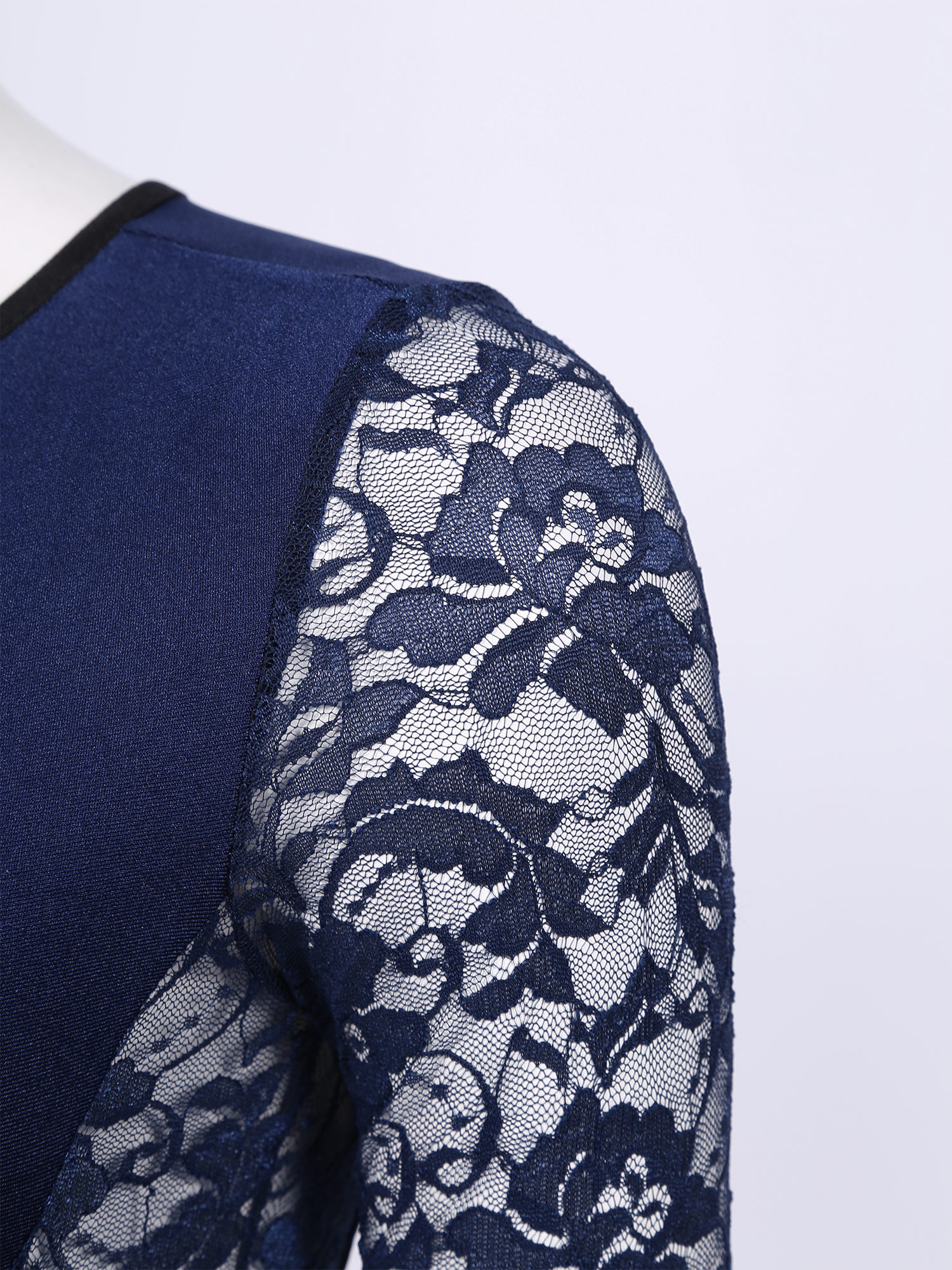 Круглый вырез, полупрозрачный спереди, кружевные длинные рукава.