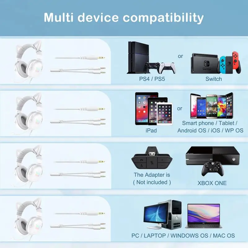 【Широкая Совместимость 】 игровые гарнитуры с кошачьими ушками легко сочетаются с PS4, PS Vita, ноутбуками, ПК, планшетами, смартфонами, Nintendo и различными другими моделями. Вы также можете подключить их к Xbox, однако, если у вас есть более старая модель, вам может потребоваться adatper (не входит в комплект), чтобы прикрепить их.