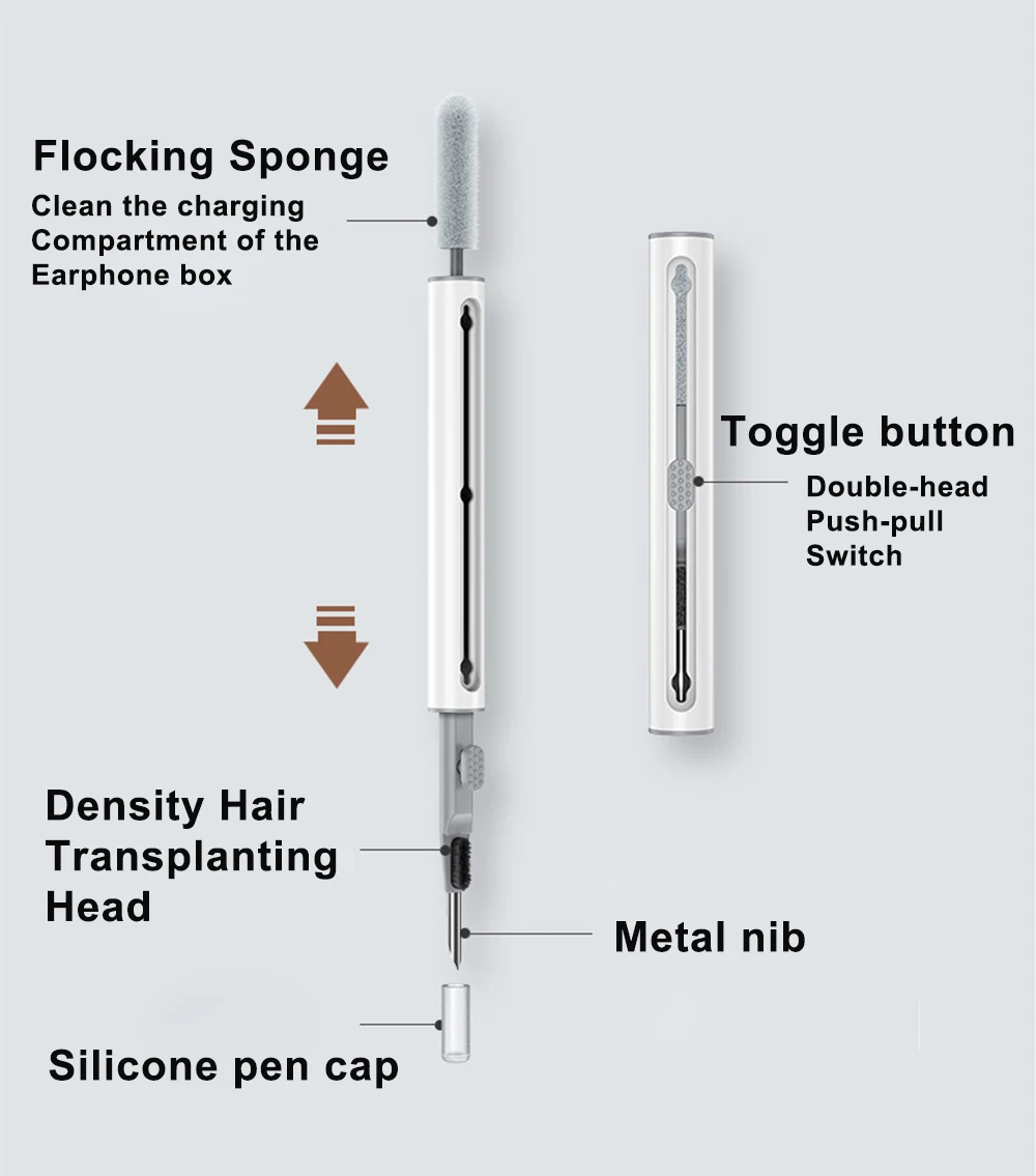 Ручка для очистки всего набора bluetooth-наушников, от небольших отверстий наушников до зарядного устройства, очистка на 360 градусов без мертвых углов. Сделайте ваши наушники дольше.