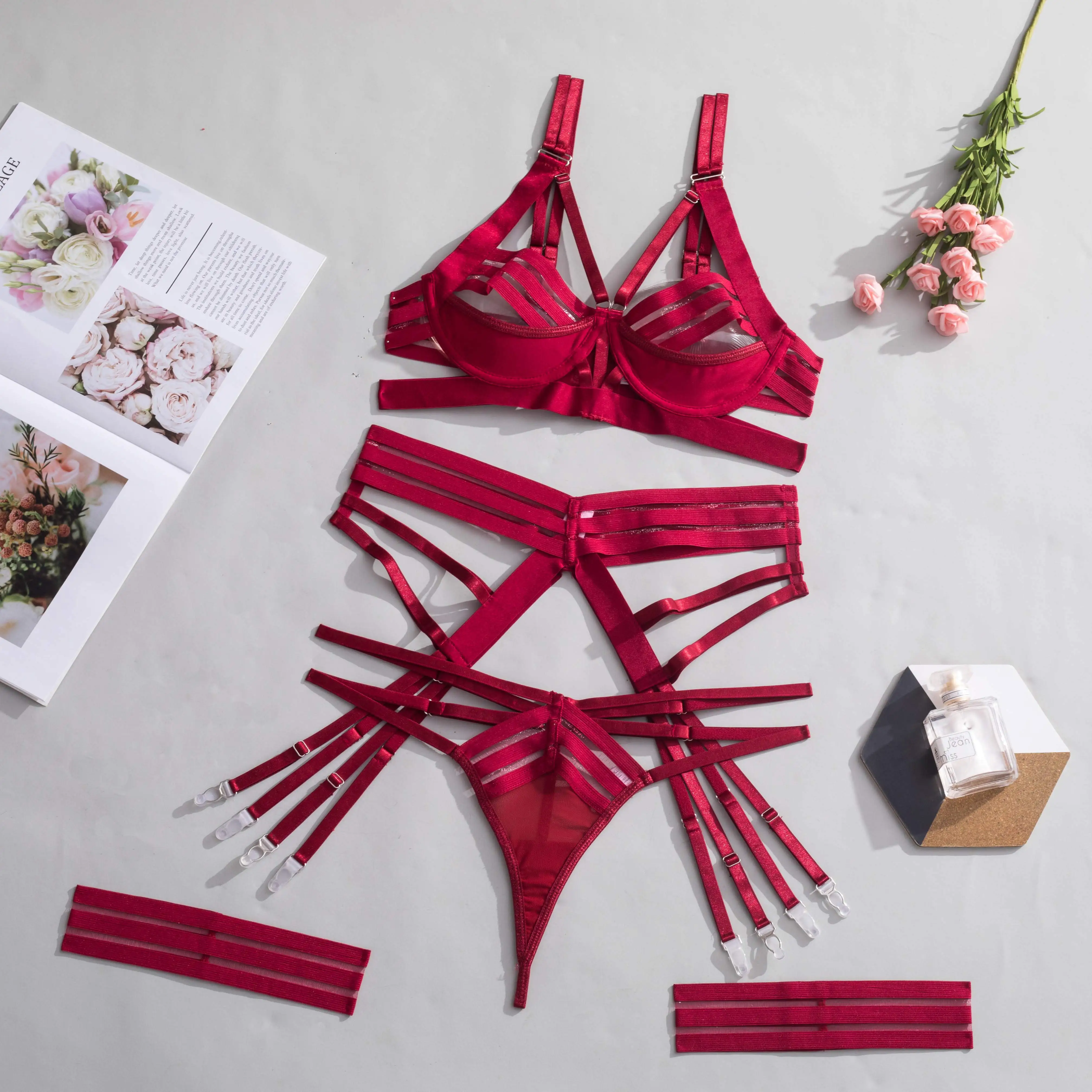 4 предмета в комплекте (бюстгальтер, штаны, платье с подвязками, 2 шт. лямки),