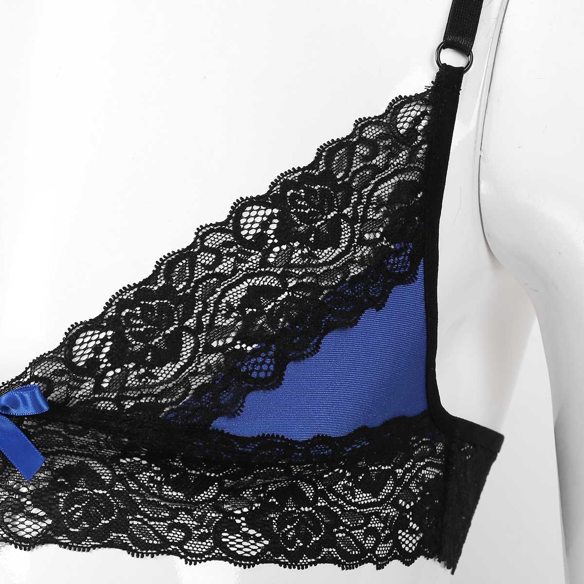 Регулируемые бретельки-спагетти, Треугольные чашечки с цветочной кружевной отделкой, застежка-липучка.