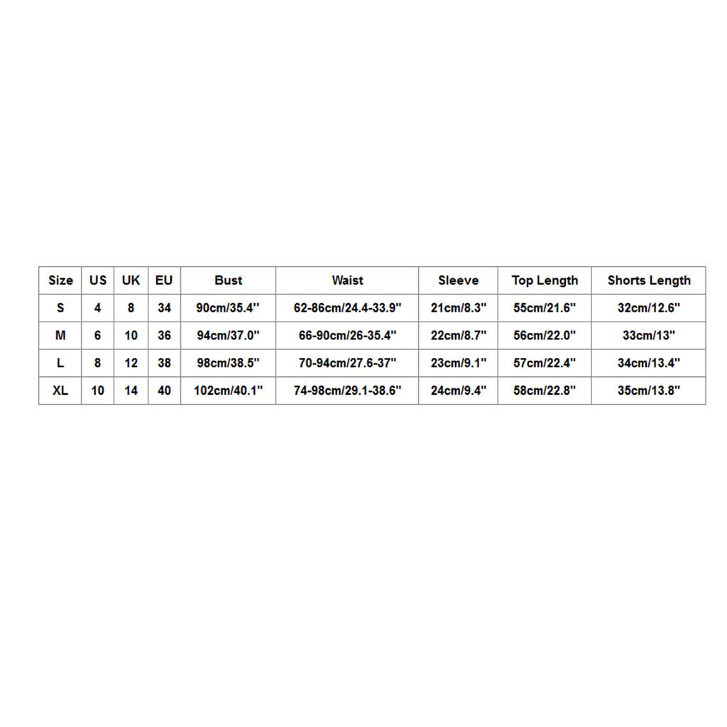 Размеры США Великобритания ЕС Бюст Талия Рукав Длина верха Длина шорт S 4 8 34 90 см/35,4'' 62-86 см/24,4-33,9" 21 см/8,3" 55 см/21,6" 32 см/12,6" М 6 10 36 94 см/37,0" 66-90 см/26-35,4" 22 см/8,7" 56 см/22,0" 33 см/13" L 8 12 38 98 см/38,5" 70-94 см/27,6-37" 23 см/9,1" 57 см/22,4" 34 см/13,4 дюйма XL 10 14 40 102 см/40,1" 74-98 см/29,1-38,6" 24 см/9,4" 58 см/22,8" 35 см/13,8"