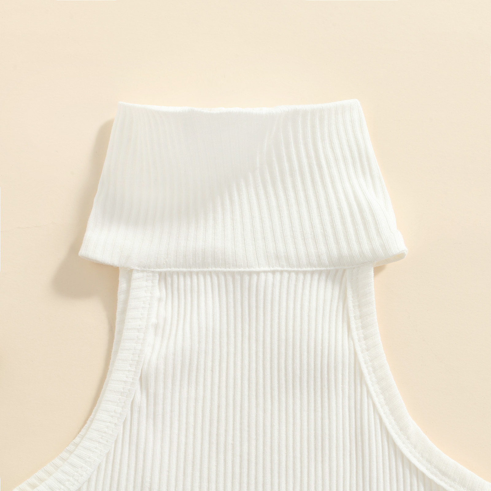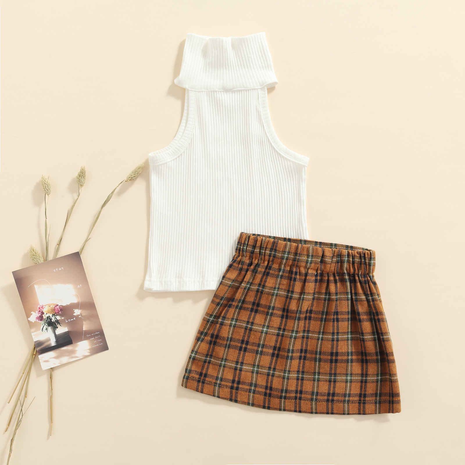 Комплект летней одежды из 2 предметов для малышей однотонный топ без рукавов в рубчик с высоким воротом + короткая юбка в клетку для девочек