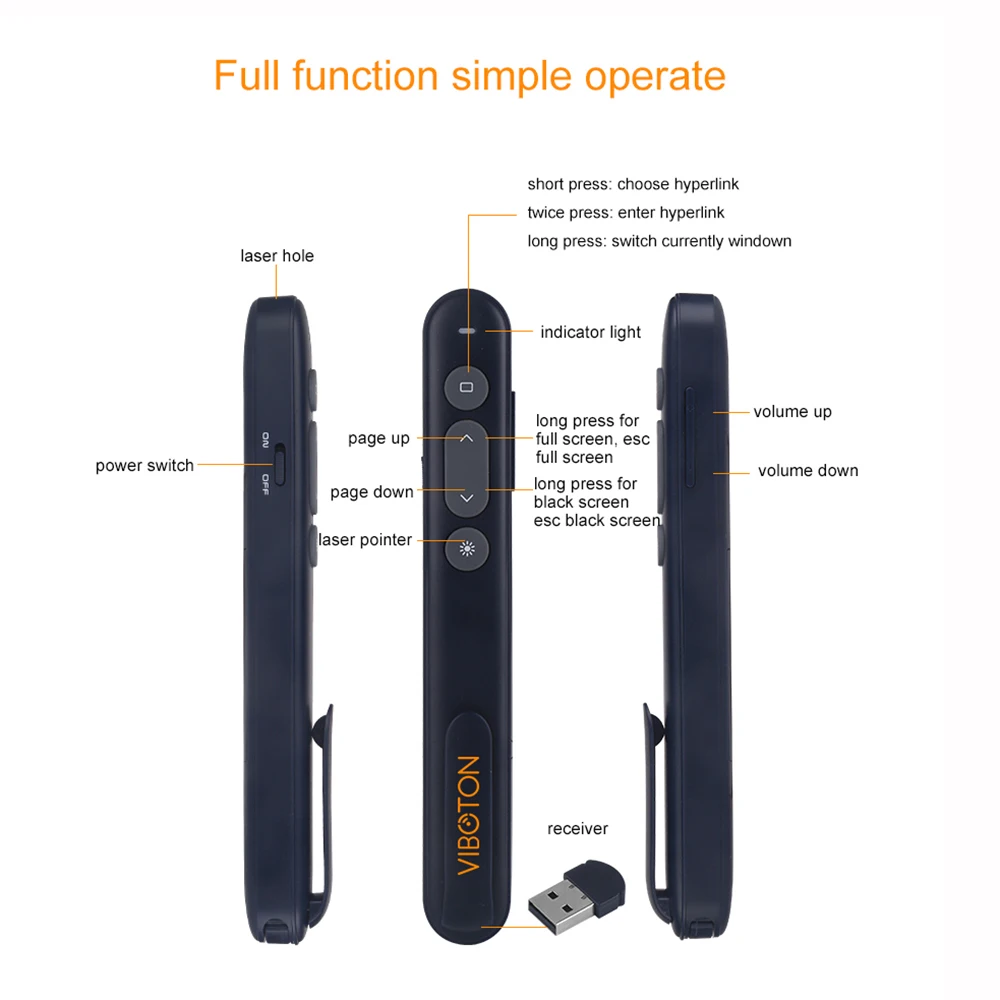 Функция: лазерная указка + страница вверх и вниз + полноэкранный черный экран + Громкость +-