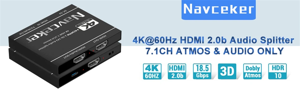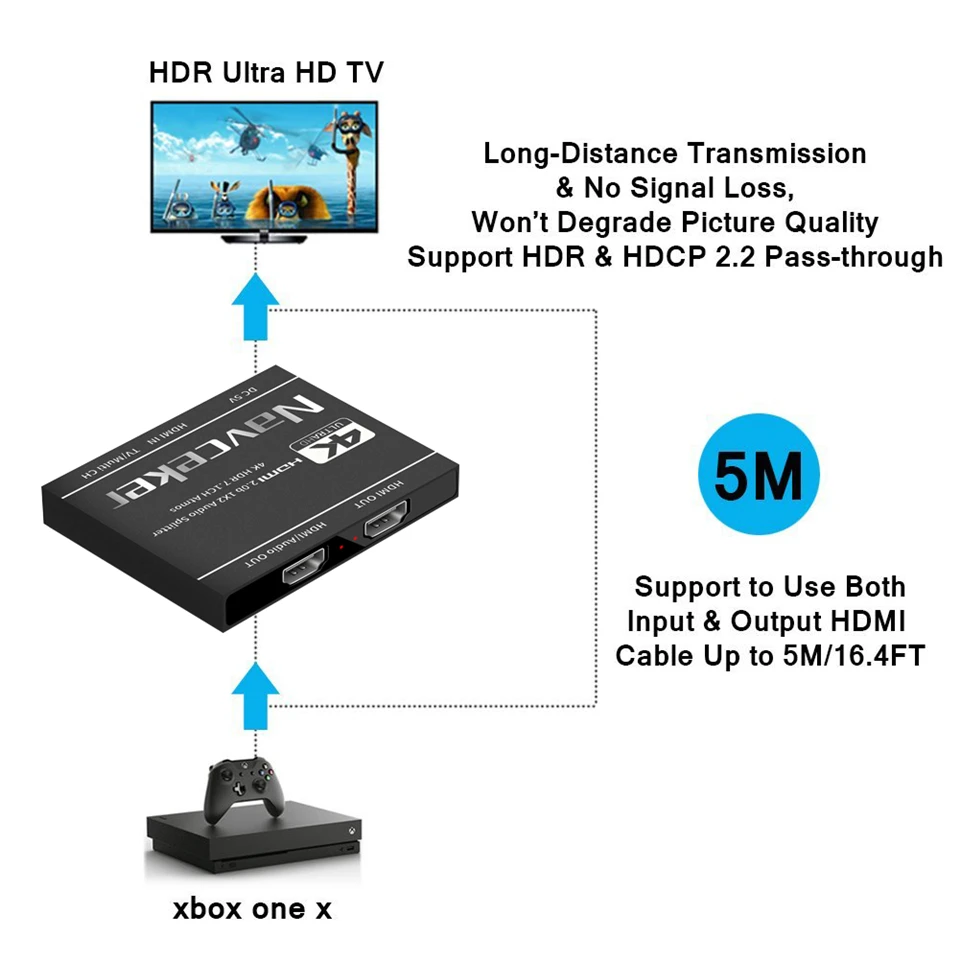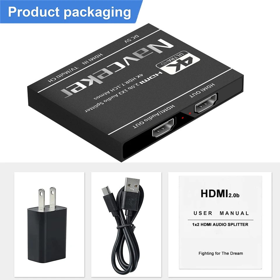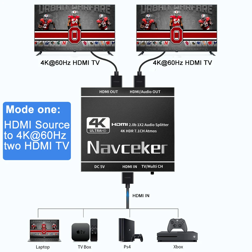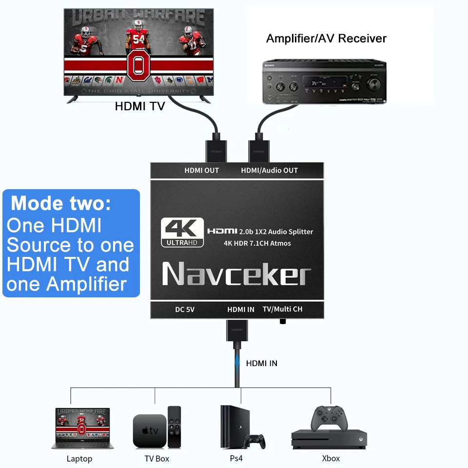 · HDMI2.0b аудио сплиттер экстрактор: Navceker HDMI 1 в 2 out сплиттер 4K @ 60Hz может распределить 1 HDMI входной сигнал на один HDMI дисплей (телевизор, монитор, проектор и т. Д.) И только один HDMI аудио (усилитель, av-приемник и т. Д.). Дублирование или зеркальное видео и аудио одновременно с любой потерей.