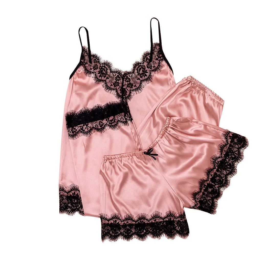 3 шт размера плюс женское кружевное Атласное Белье для сна с v-образным вырезом без рукавов камзол шорты с бантиком Брюки повседневные пижамы комплект S-3XL