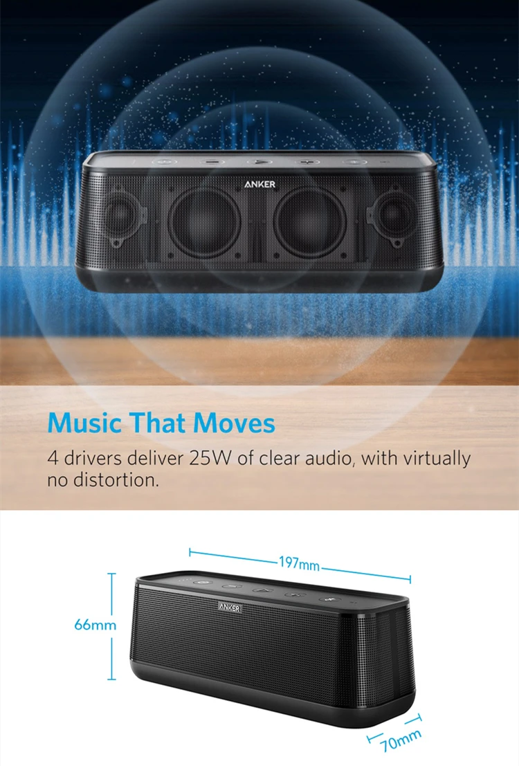 SoundCore Pro +-высококачественный bluetooth-динамик с сверхвысоким качеством звука и тяжелыми басами, обработкой цифрового сигнала профессионального качества и тяжелым звуком: В передней части динамика есть 2 полнодиапазонных и 2 твитера в металлической сетке, с общей мощностью 25 Вт и 2 на задней части. Низкочастотный пассивный радиатор, динамик вибрирует при использовании, а в нижней части динамика есть противоскользящие подушечки, поэтому нет необходимости беспокоиться о скольжении во время использования. Наслаждайтесь прекрасными высокими и насыщенными басами, обеспечивая захватывающий опыт прослушивания.