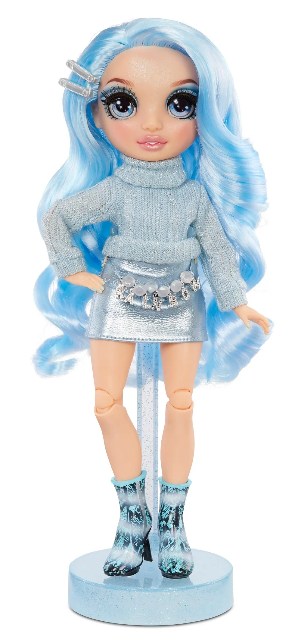 Куколка Айс с длинными голубыми волосами. Одета в теплый вязаный свитер и юбку, на ногах ботинки на высокой платформе. В комплекте дополнительный наряд, состоящий из топика, куртки и юбки. У куколки шарнирные части туловища, умеет кивать. В наборе: • кукла • комплект одежды и обуви • аксессуары • расческа для волос Особенности набора: • шарнирные части туловища, принимает разные позы • кивает • волосы расчесываются и укладываются в стильные прически