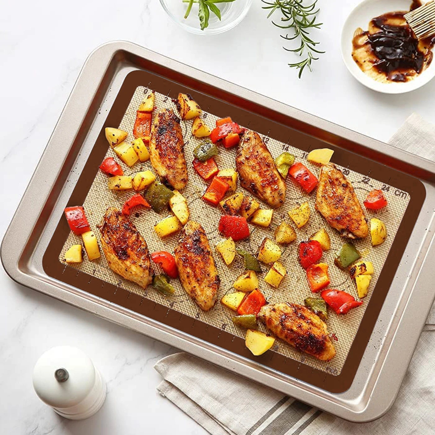 ��【 100% PLATINUM пищевой силикон velvet】, потому что включают в себя стекловолоконная сетка внутри из пищевого силикона, не считая их неприлипающая поверхность, они обеспечивают равномерное распределение тепла. Коврик для выпечки не будет производить специфический запах или дым при 482 °C.