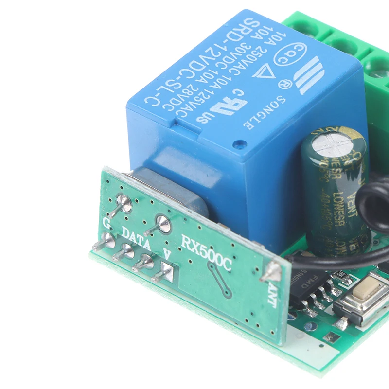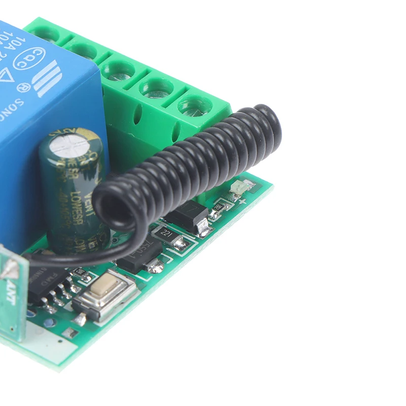 Входное напряжение: 12 В • Чувствительность приемника: > 97 дБм • Расстояние передачи:> 100 м (открытое пространство) • Режим декодирования: программное декодирование MCU • Удаленное Хранение: 20 • Поддержка удаленного типа: код обучения EV1527 • Режим работы: Мгновенный, переключаемый, задержка времени блокировки (5s ,10s ,15s) • Выходной терминал: NO , NC , COM • Размеры печатной платы: 35x30x18 мм (Д, Ш, в) • Батарея дистанционного управления: 2 батарейки CR2016 на 3 в Примечание: Максимальная входная мощность 12 В Дистанционное программирование Рабочий режим: 1. Режим ввода: нажмите на пульт дистанционного управления, реле подключится, а затем отпустите пульт дистанционного управления, чтобы отсоединить реле; 2. Режим самоблокировки: нажмите на пульт дистанционного управления, реле подключится, а затем нажмите на пульт дистанционного управления снова, чтобы отсоединить реле; 3. Режим блокировки: нажмите клавишу дистанционного управления A для подключения реле и нажмите кнопку дистанционного управления B для отключения Реле. 4. Режим задержки: нажмите на пульт дистанционного управления, реле подключится, отпустите пульт дистанционного управления и начните синхронизацию. После 5S, 10S и 15S (3 шестерни), реле будет автоматически закрыто. Методы обучения: 1. Метод обучения: Нажмите кнопку сопряжения кода на панели управления один раз, и светодиодный индикатор будет мигать один раз. После того, как светодиодный индикатор загорится, нажмите кнопку, которая вам нужна для сопряжения с пультом дистанционного управления, светодиодный индикатор на панели управления будет мигать 3 раза, что означает, что сопряжение успешно. 2. Самоблокирующийся метод обучения: Дважды нажмите кнопку сопряжения кода на панели управления, и светодиодный индикатор будет мигать дважды. После того, как светодиодный индикатор загорится, нажмите кнопку, которая вам нужна для сопряжения на пульте дистанционного управления, светодиодный индикатор на пульте управления будет мигать 3 раза, что означает, что сопряжение успешно. 3. Метод обучения взаимной блокировки: Нажмите кнопку сопряжения кода на панели управления три раза, и светодиодный индикатор будет мигать три раза. После того, как светодиодный индикатор загорится, нажмите кнопку, которая вам нужна для сопряжения на пульте дистанционного управления, светодиодный индикатор на пульте управления будет мигать 3 раза, что означает, что сопряжение успешно. 4. 5S метод задержки обучения: Четыре раза нажмите кнопку сопряжения кода на панели управления, и светодиодный индикатор будет мигать четыре раза. После того, как светодиодный индикатор загорится, нажмите кнопку, которая вам нужна для сопряжения на пульте дистанционного управления, светодиодный индикатор на пульте управления будет мигать 3 раза, что означает, что сопряжение успешно. 5. 10S метод задержки обучения: Нажмите кнопку сопряжения кода на панели управления пять раз, и светодиодный индикатор будет мигать пять раз. После того, как светодиодный индикатор загорится, нажмите кнопку, которая вам нужна для сопряжения на пульте дистанционного управления, светодиодный индикатор на пульте управления будет мигать 3 раза, что означает, что сопряжение успешно. 6. 15S метод задержки обучения: Нажмите кнопку сопряжения кода на панели управления шесть раз, и светодиодный индикатор будет мигать ше