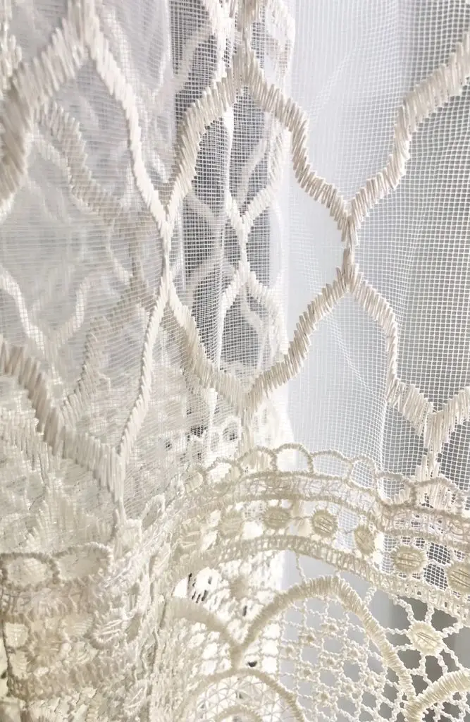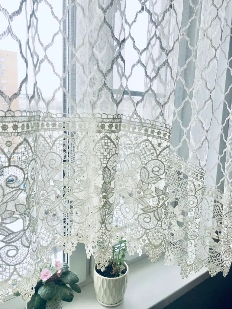 кружево. Пришита хлопковая шторная лента под крючки, позволяющая сделать сборку. Тюль идеально подойдет для кухни, столовой и детской комнаты.