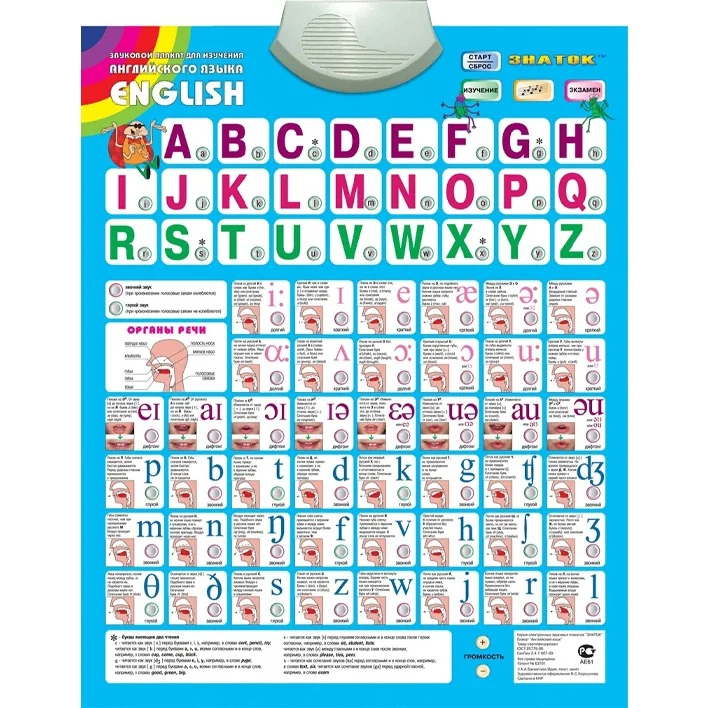 Предназначен для детей и взрослых, начинающих изучать русский язык. Дополнения в плакат были внесены в соответствии с пожеланиями родителей и педагогов. В процессе пользования плакатом можно познакомиться не только с «именем» буквы, но и её звуком и порядковым номером, услышать стихи и весёлую песенку про алфавит, а так же сдать экзамен. Имеет 8 режимов работы, которые можно выбрать, дотронувшись «Говорящей ручкой ЗНАТОК» до соответствующей кнопки, а затем до изображения на плакате.