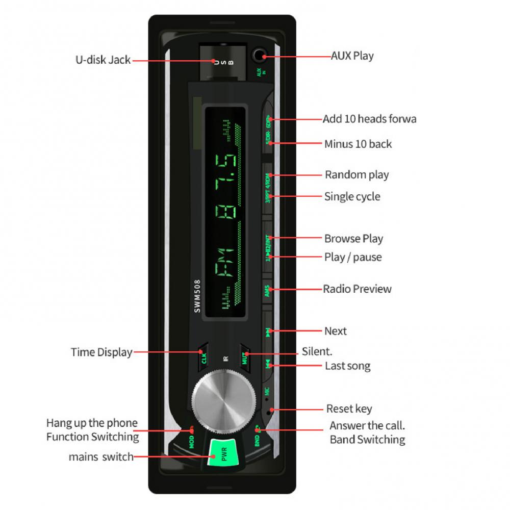 Оснащен высокопроизводительным fm-радио усилителем, он может обеспечить более стабильный эффект радио, а Автоматическая/ручная станция поиска диапазона может хранить 18 станций. Поддерживает Bluetooth, USB флеш-накопитель, tf-карту, воспроизведение AUX.