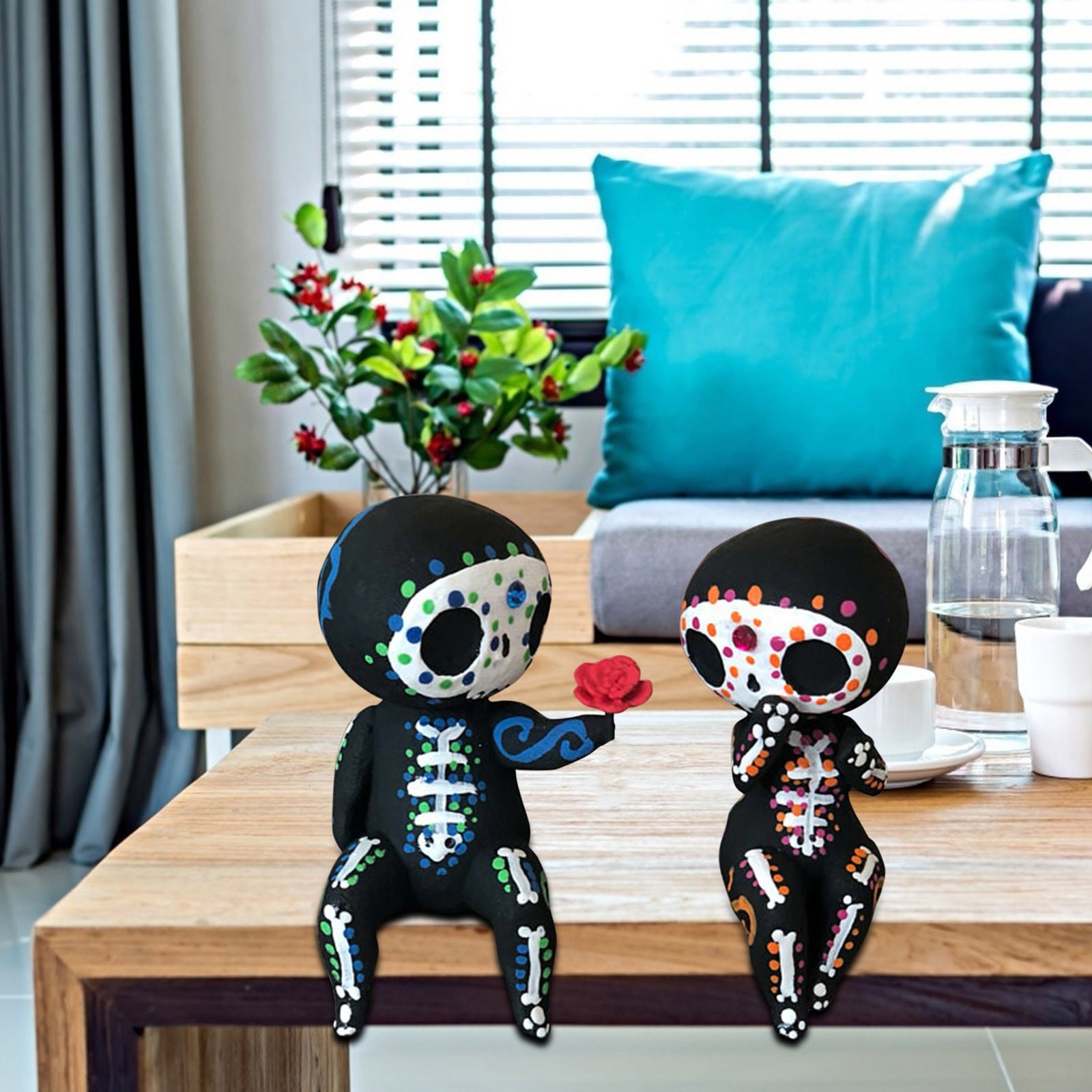 It is a couple of sugar skulls. They are designed to sit on the ledge of something, so why they are photos of sitting on decorative boxes. Hand a flower in blue and green to a flower in orange and pink. Please note that the orange and pink design looks like awoman (she is curvy, smaller, and has eyelashes.) I am willing to change it for those who request it (for example, to make two males or two females). Please send me a message. For a while I felt pain that they could only sit on the windowsill. I thought somepeople might not like this, so even though it was not shown, I chose to let them sit on the 3D printed black rectangle while their legs were still hanging. In this case, they will be fixed to the module as one piece (they will not loose up and down). Basic options: The "loose" option means that these figurines will be placed on the ledge of your choice as shown, so that their legs can be hung. They will not connect to the base. They must be placed on a ledge where feet and legs can be hung. The "loose" option is the one I have in the reference photo. Their hips are flat, so they can sit on the edge of the window sill and their legs can hang down.Products include: