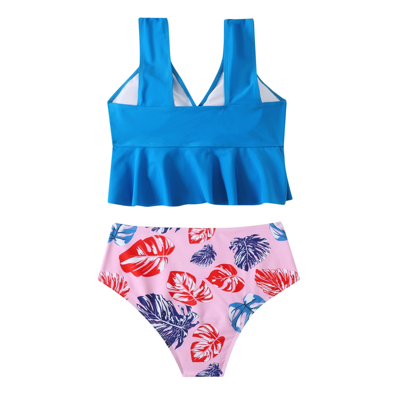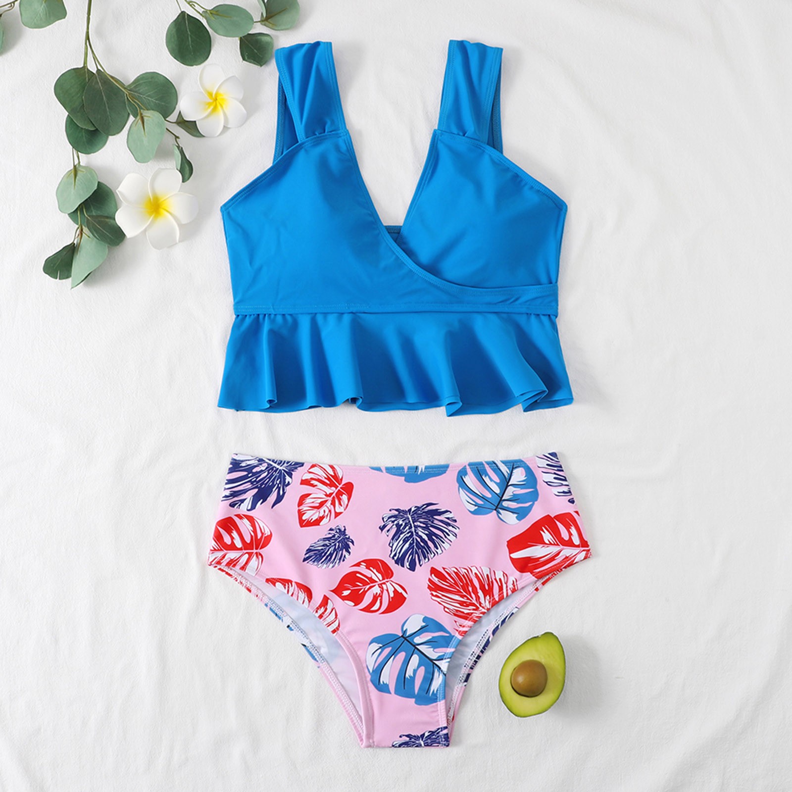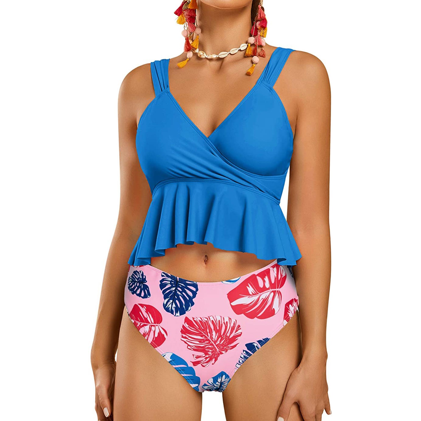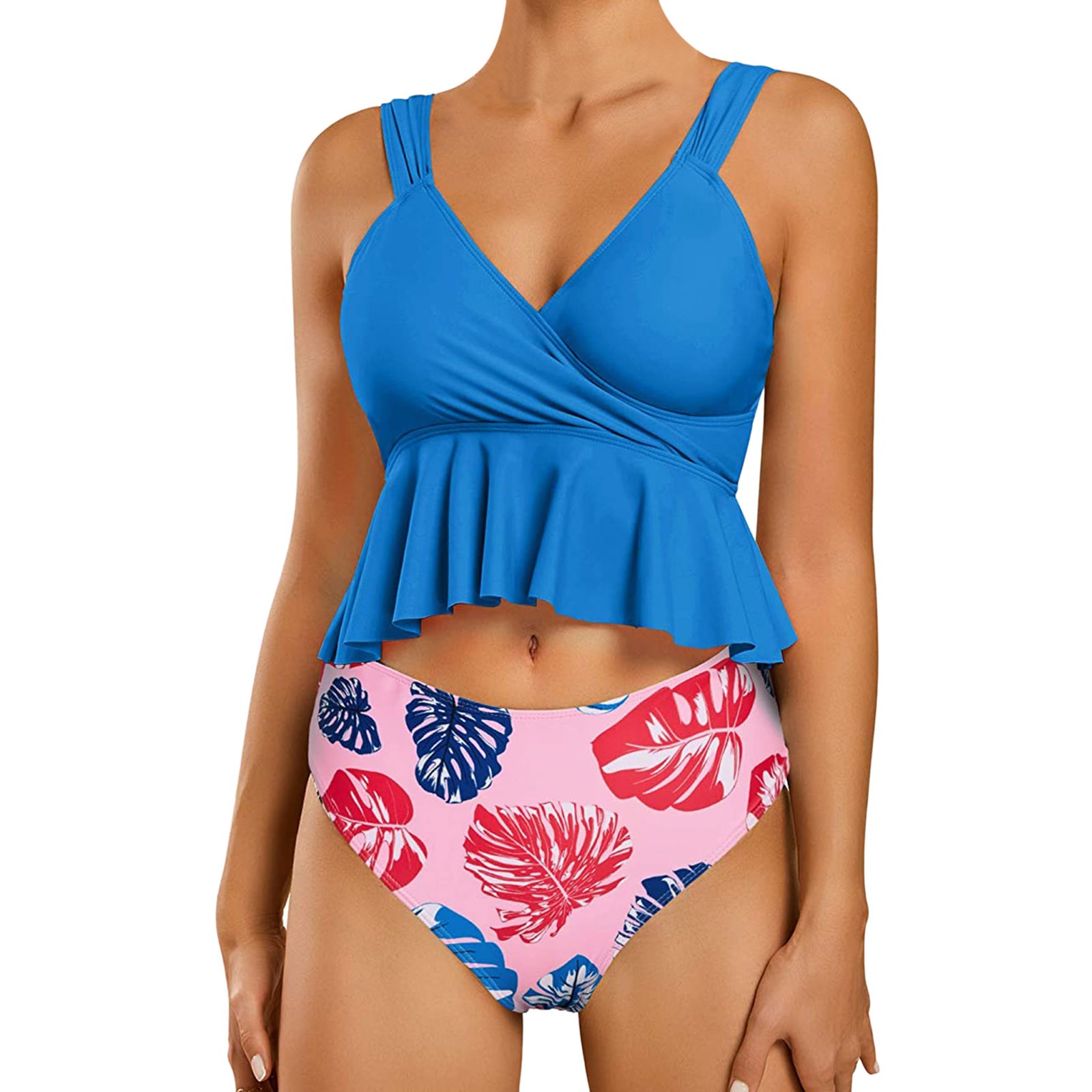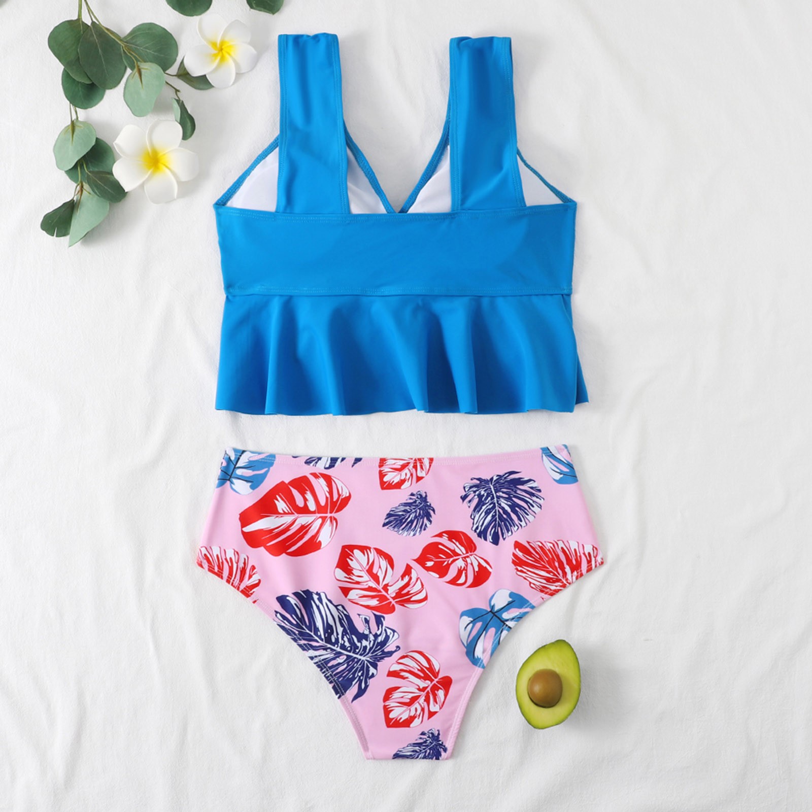 Женский винтажный купальник из двух частей, бикини, купальник, Ретро стиль, Холтер, с рюшами, высокая талия, принт, купальный костюм, комплект бикини