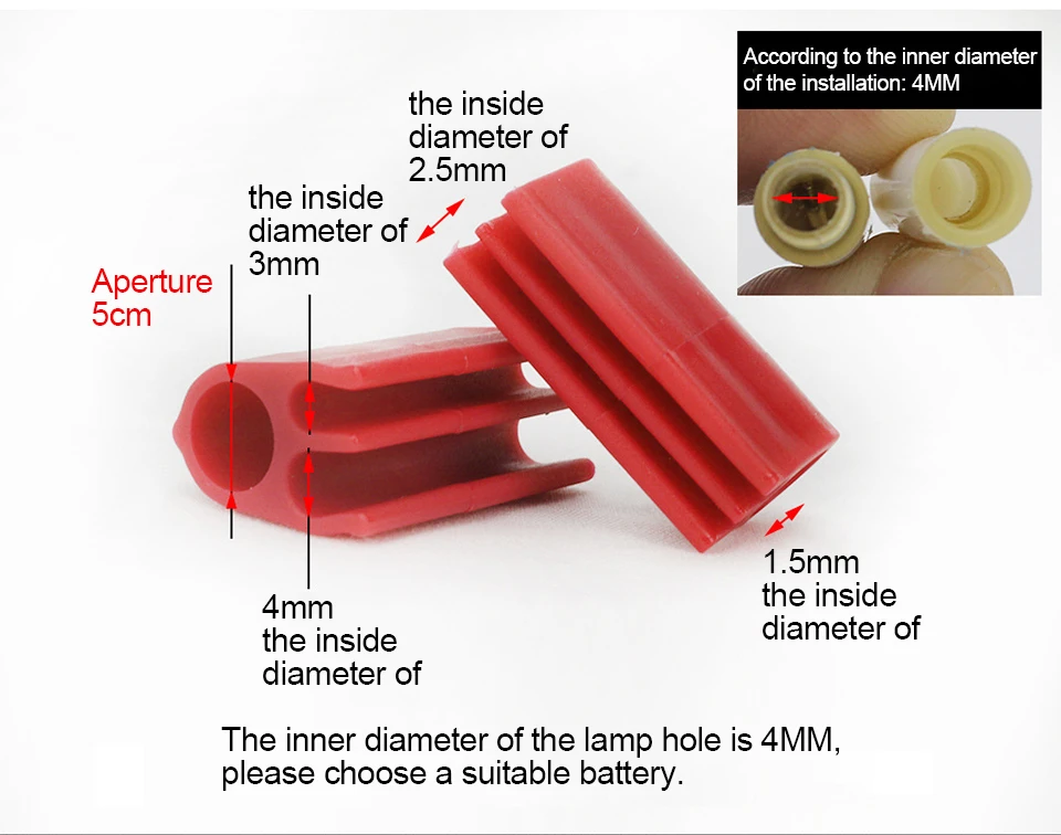 Максимальный внутренний диаметр отверстия лампы 4 мм, пожалуйста, выберите подходящий аккумулятор.