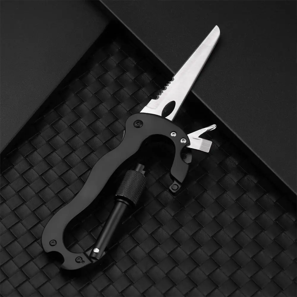 Многофункциональный Карабин Для Ключей имеет такие функции, как складной нож, Отвертка phillips, шлицевая отвертка, открывалка для бутылок и т. д. Острое лезвие из нержавеющей стали и алюминиевая ручка легкие и компактные. Вы можете использовать его в качестве брелка или в качестве крючка для собачьей повязки или гамака. Легкий анодированный черный алюминиевый карабин с канавками для комфортного ношения. Этот карабин практичный и удобный. Это обязательный вариант для активного отдыха, например кемпинга, альпинизма, походов и охоты. Спецификация: Материал изделия: нержавеющая сталь + алюминий В сложенном виде Длина: 10,5 см Длина стрейч: 18 см Лезвие Длина: 7,5 см Ширина лезвия: 2 см Лезвие Толщина: 0,2 мм Поверхность: анодированная Цвет: черный Вес: 80 г Посылка включает в себя: 1*5 в 1 Многофункциональный Карабин