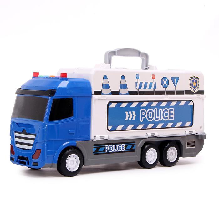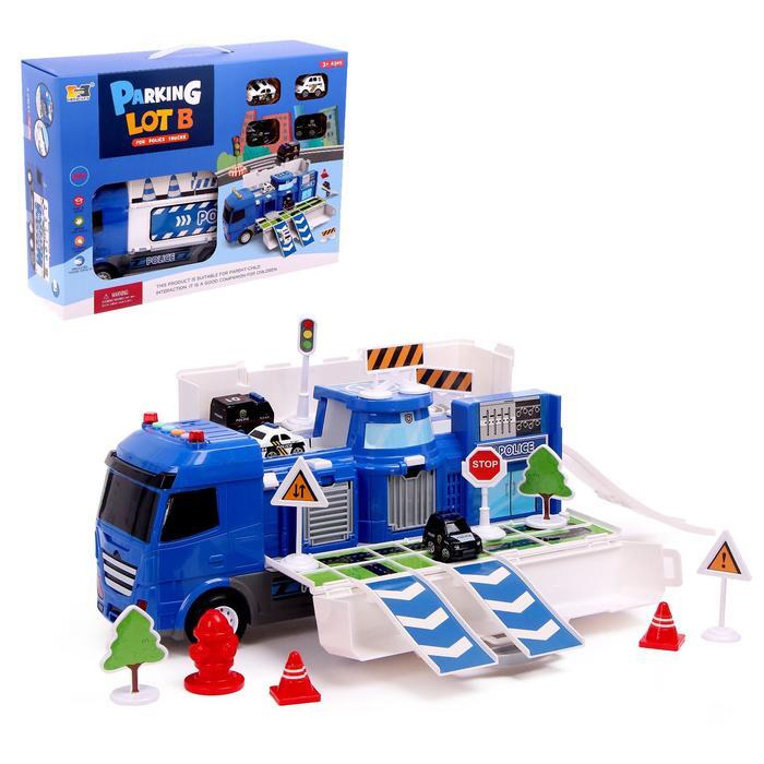 Каждый юный автолюбитель мечтает о своём гараже. Игровой набор "Полицейский участок" — это мобильная парковка с трансформацией, она быстро доставит служебный транспорт в нужную точку.В комплект входит:грузовик-парковка,аксессуары,4 машинки.
