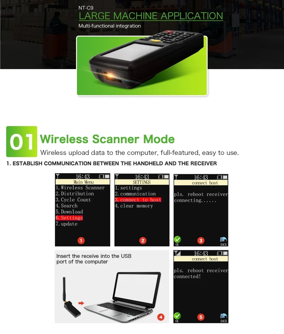 Инвентаризации режим может сэкономить до 30000 шт. данных штрих-кода. Он работает в автономном режиме во время сбора данных. Сохраненные данные о запасах могут быть отправлены на базовую станцию и компьютер в одной партии после сбора всех сборщик данных штрих-кода.
