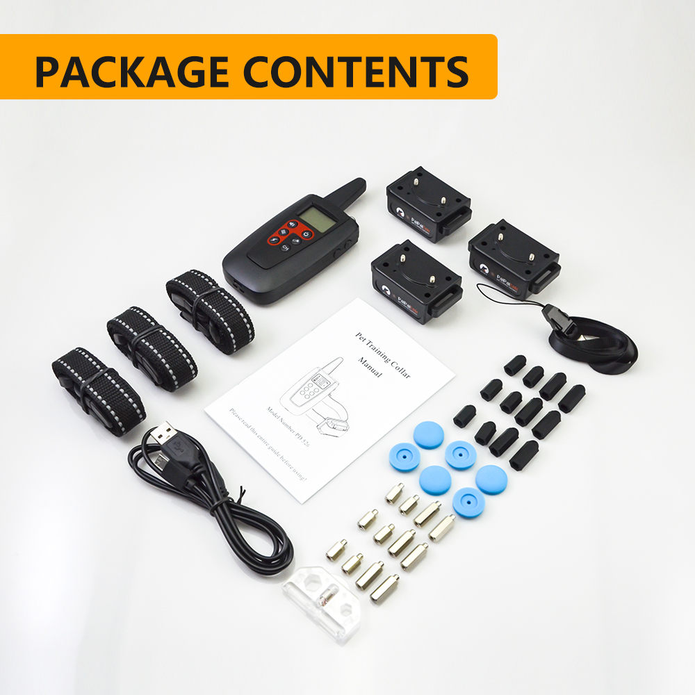 9. Adjustable Black Reflective Nylon CollarAbout IP67 Waterproof Level1. The receiver of PD PD 526-3 has IP67 waterproof design. It can use in the bathing, rain or snow.2. The charging rubber cap must be closely covered when your dog swimming or the receiver will get broken when getting into water