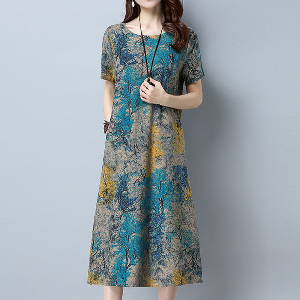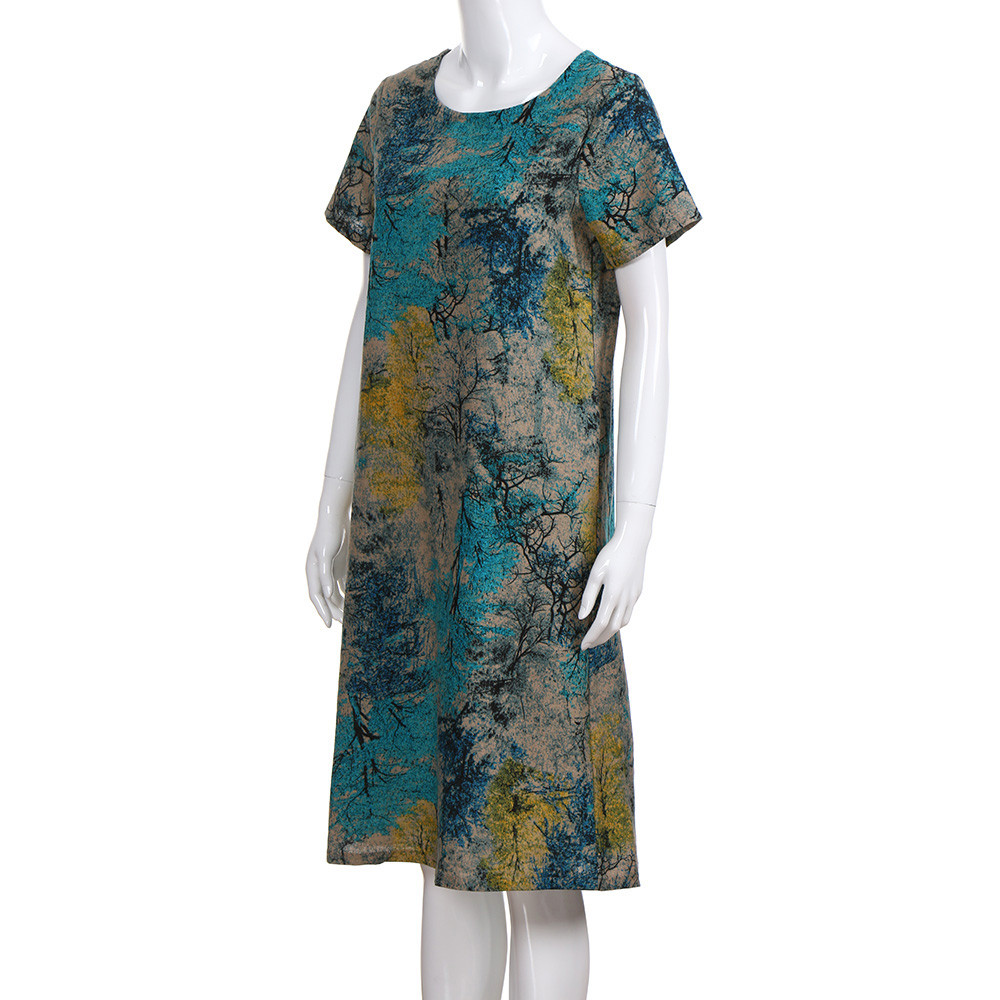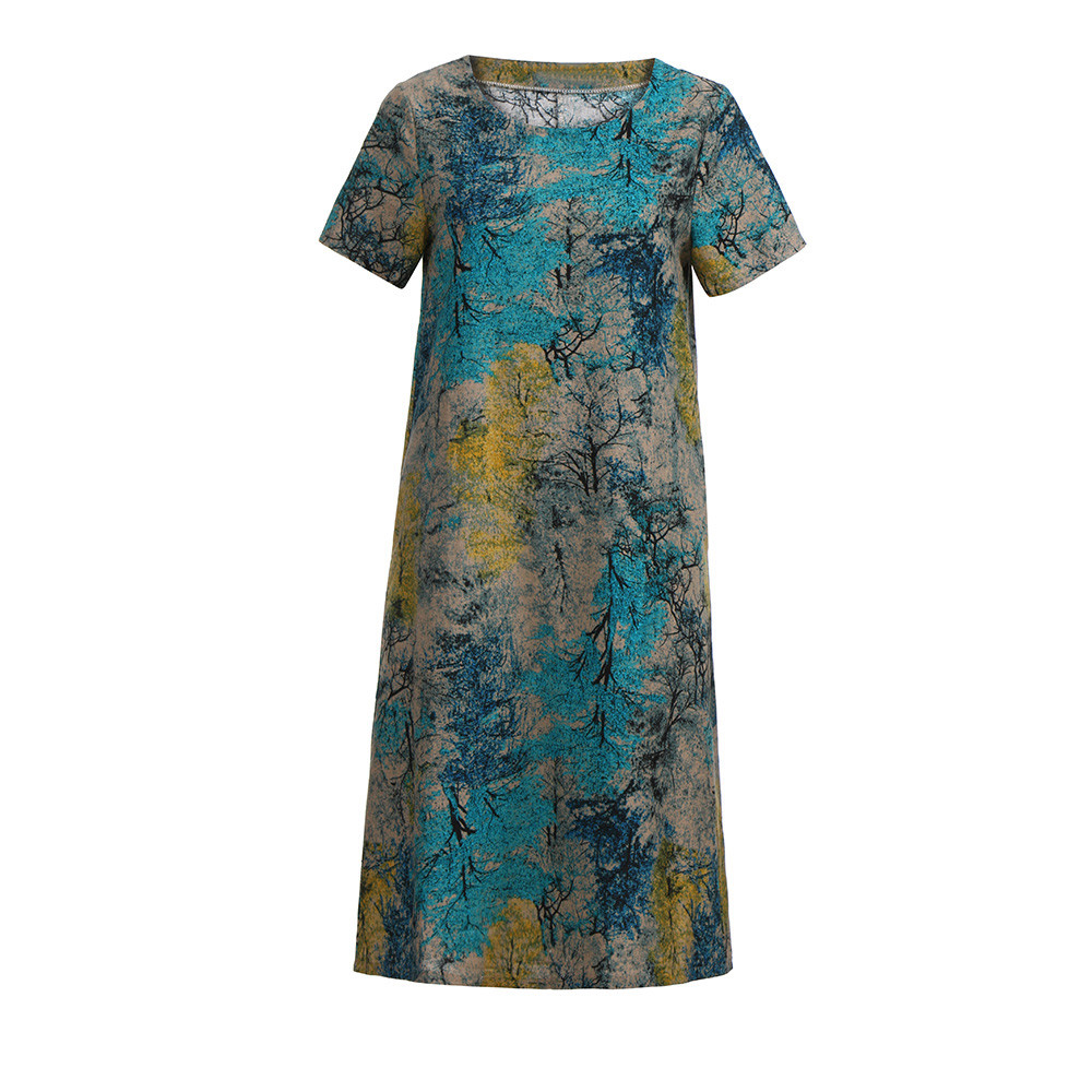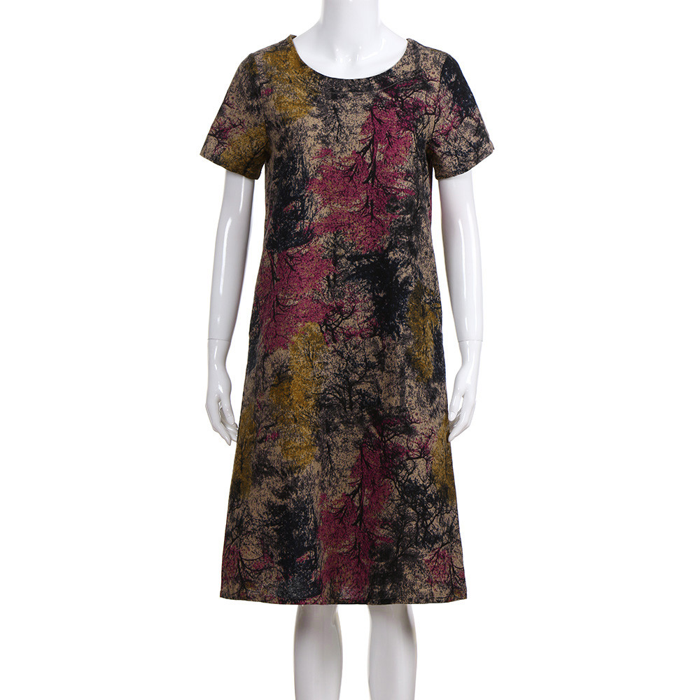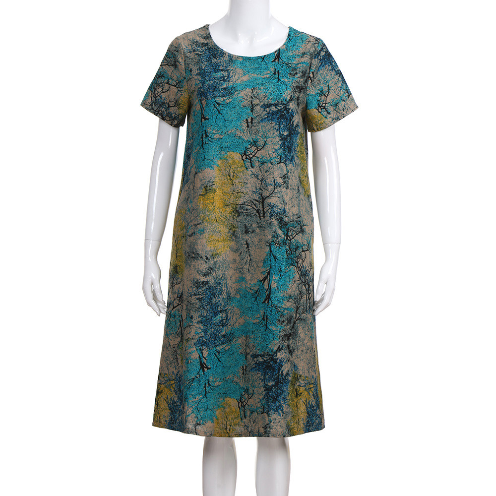 Модное женское свободное Повседневное платье из хлопка и льна с коротким рукавом и круглым вырезом