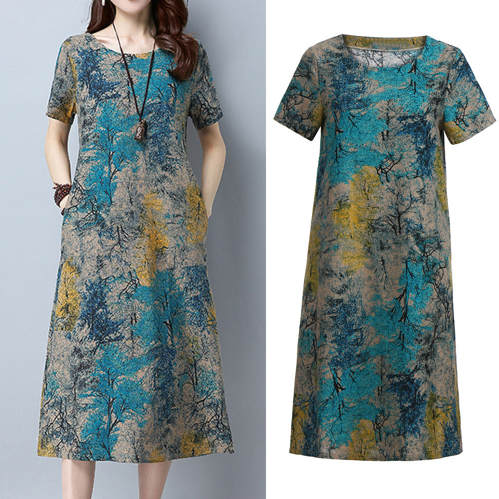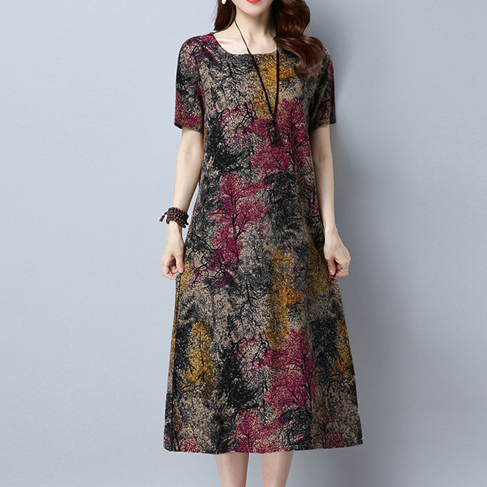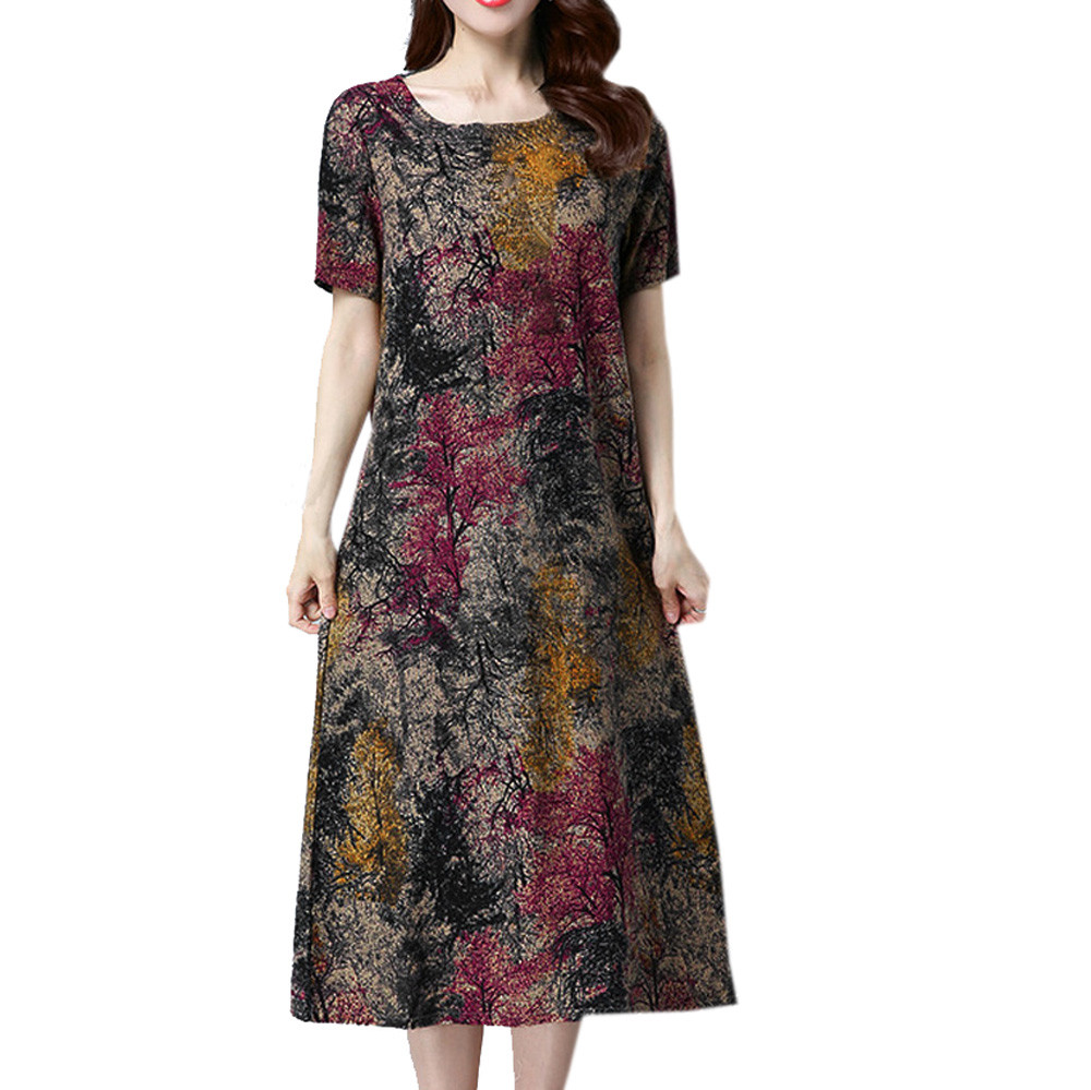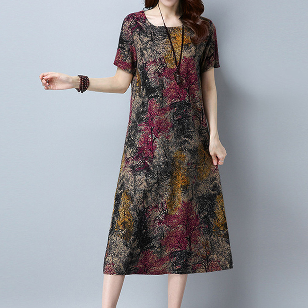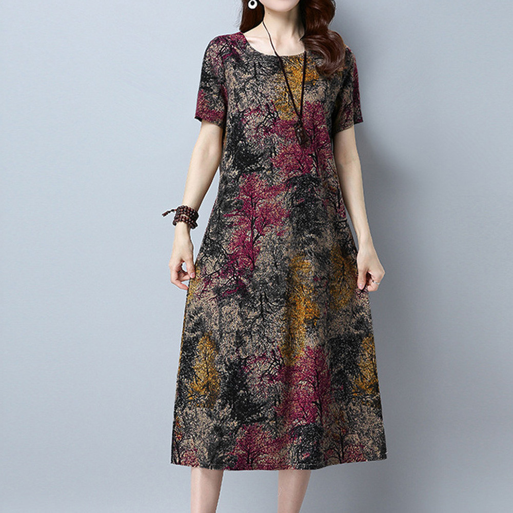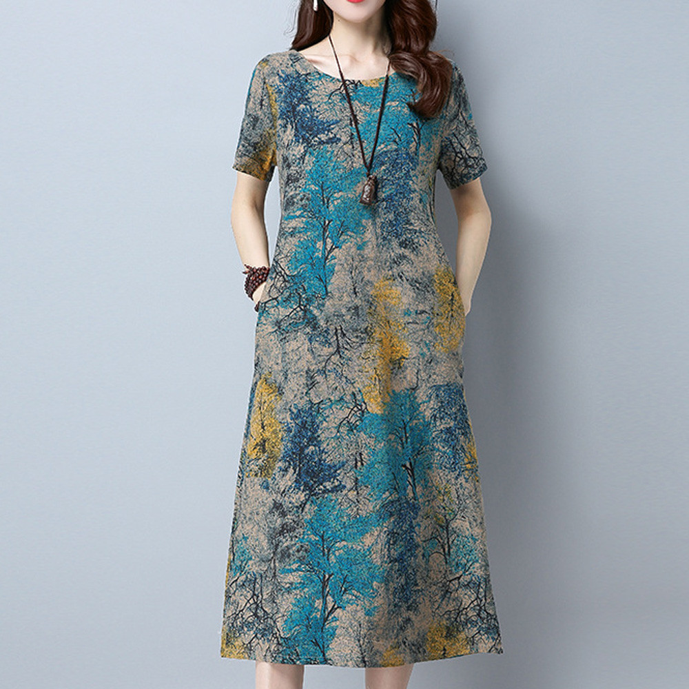 Модное женское свободное Повседневное платье из хлопка и льна с коротким рукавом и круглым вырезом
