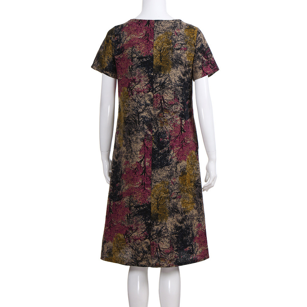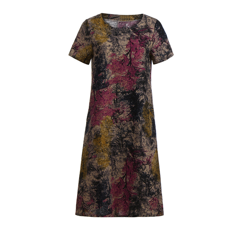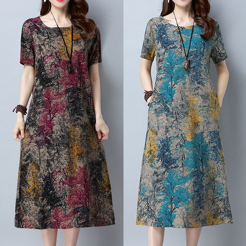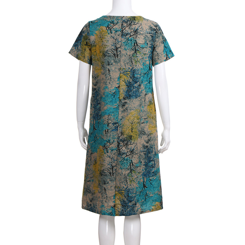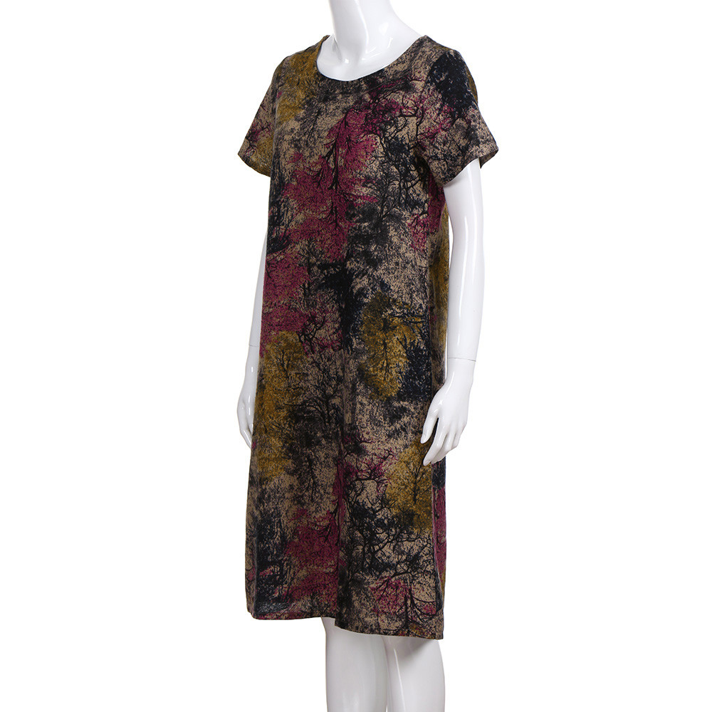 Модное женское свободное Повседневное платье из хлопка и льна с коротким рукавом и круглым вырезом