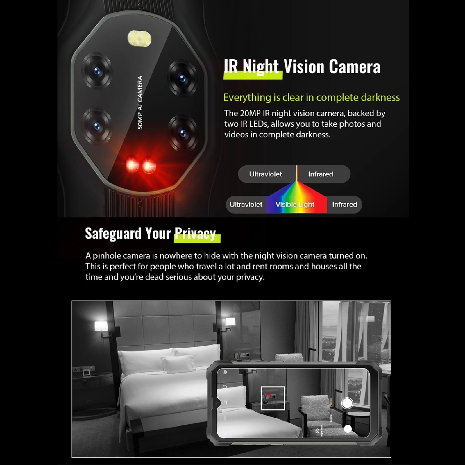 4. Задние камеры: 50MP S5KJN1SQ03-FGX9 + 8MP GC8034 + 20MP IMX376 + 0.3MP GC032A задние камеры, с флэш-светильник, хорошо для получения четких фотографий.