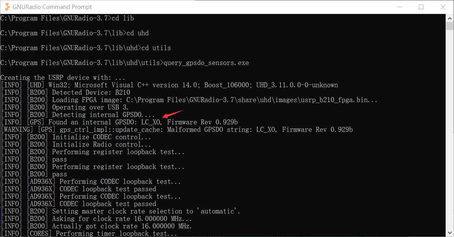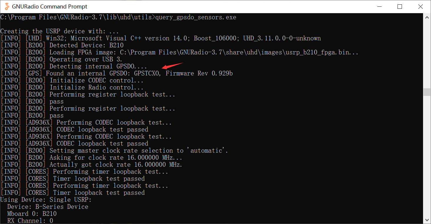 GPS-DO(TCXO)版本硬件,再USRP-B210及X310系列硬件中被UHD识别的信息,注意红色箭头。