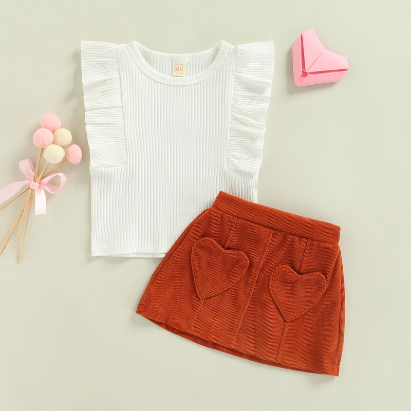 ОписаниеЛетние комплекты для девочек из 2 предметов; Однотонные топы без рукавов с круглым вырезом и оборками + короткая юбка с сердечками для детейЕсли у продукта есть какие-либо проблемы с качеством, пожалуйста, свяжитесь с нами, мы поможем вам решить проблему как можно быстрее.