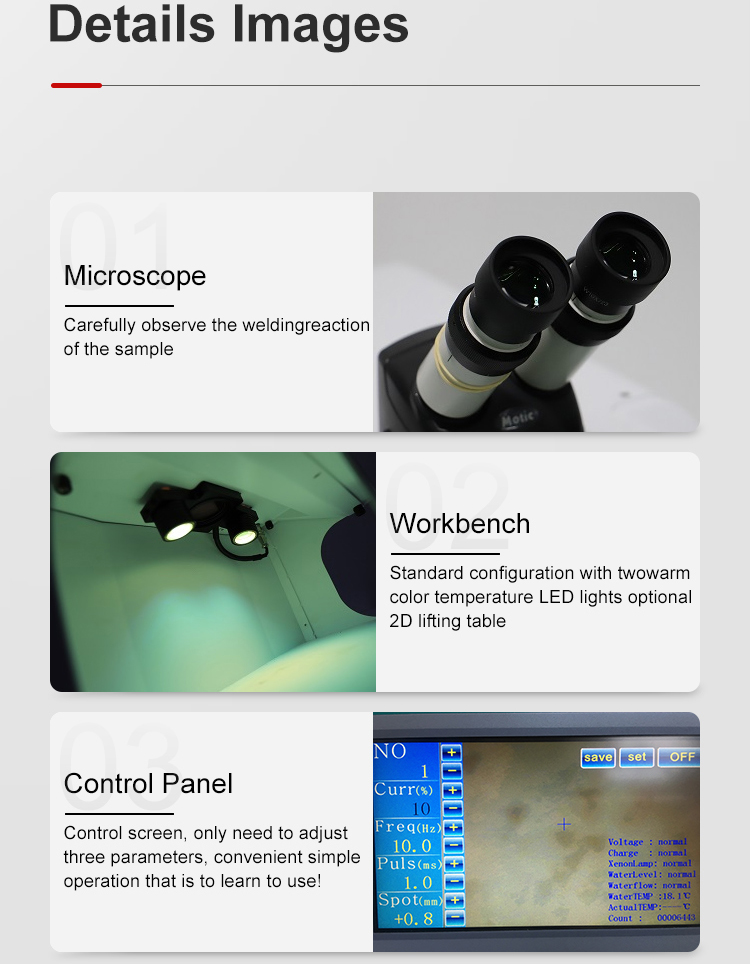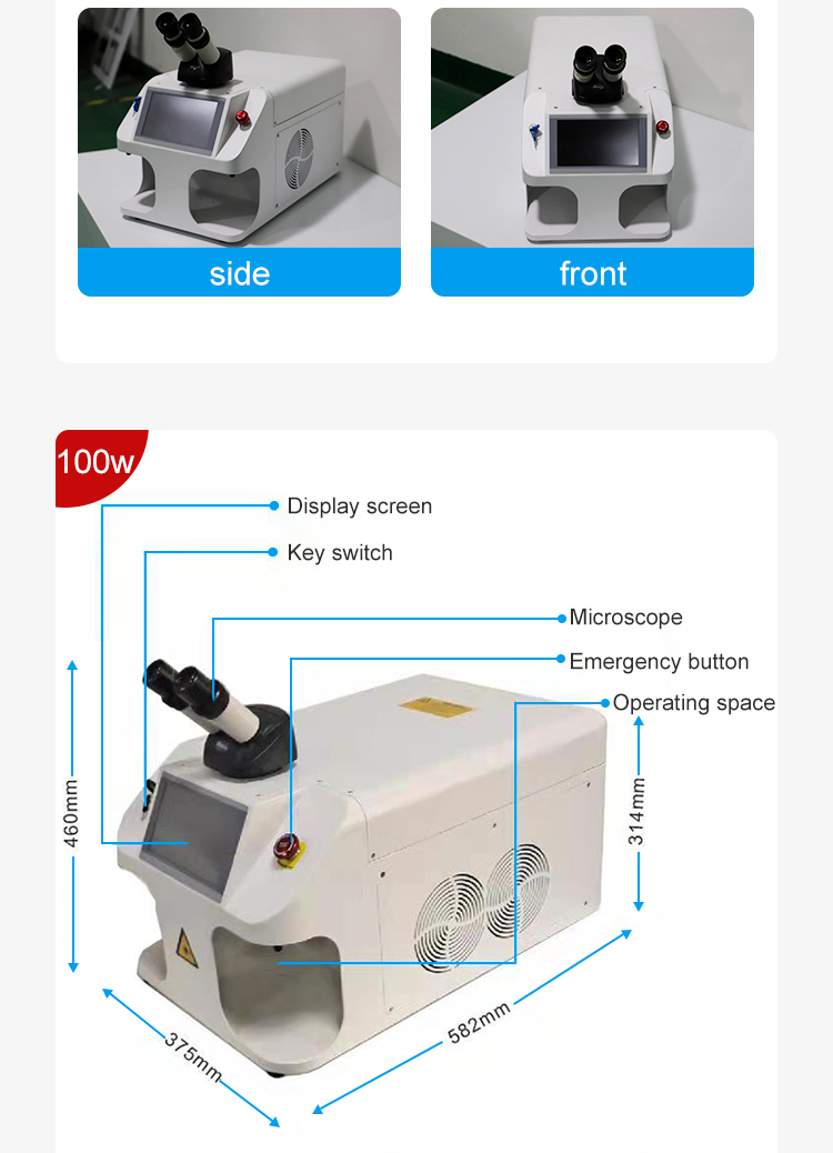 1. Система наблюдения:Система наблюдения этого аппарата для сварки ювелирных изделий состоит из микроскопа и встроенной CCD камеры высокой четкости. Пользователи могут выбрать один или два из них в качестве метода наблюдения в соответствии с их потребностями. Оба могут четко наблюдать положение сварки заготовки, что удобно для сварки.