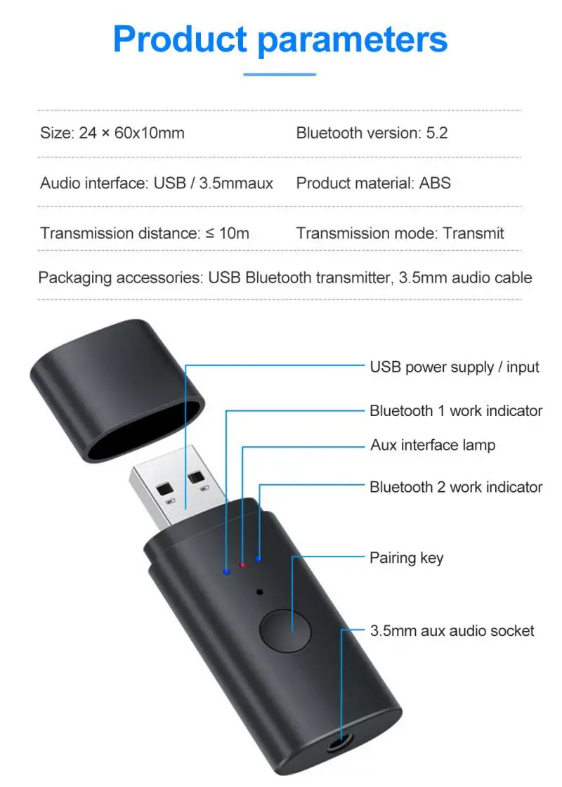 Комплектация: 1 * USB Bluetooth передатчик 1*3,5 мм аудио кабель