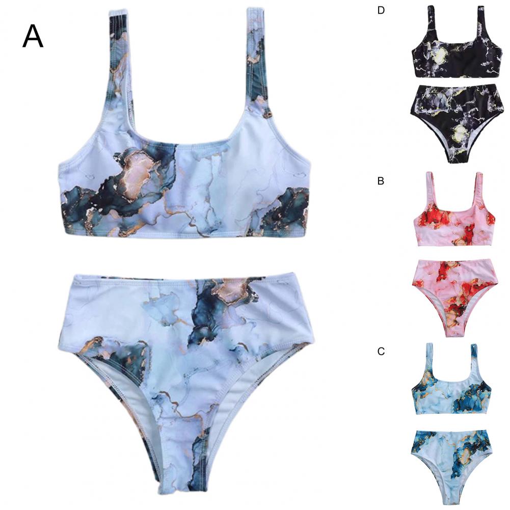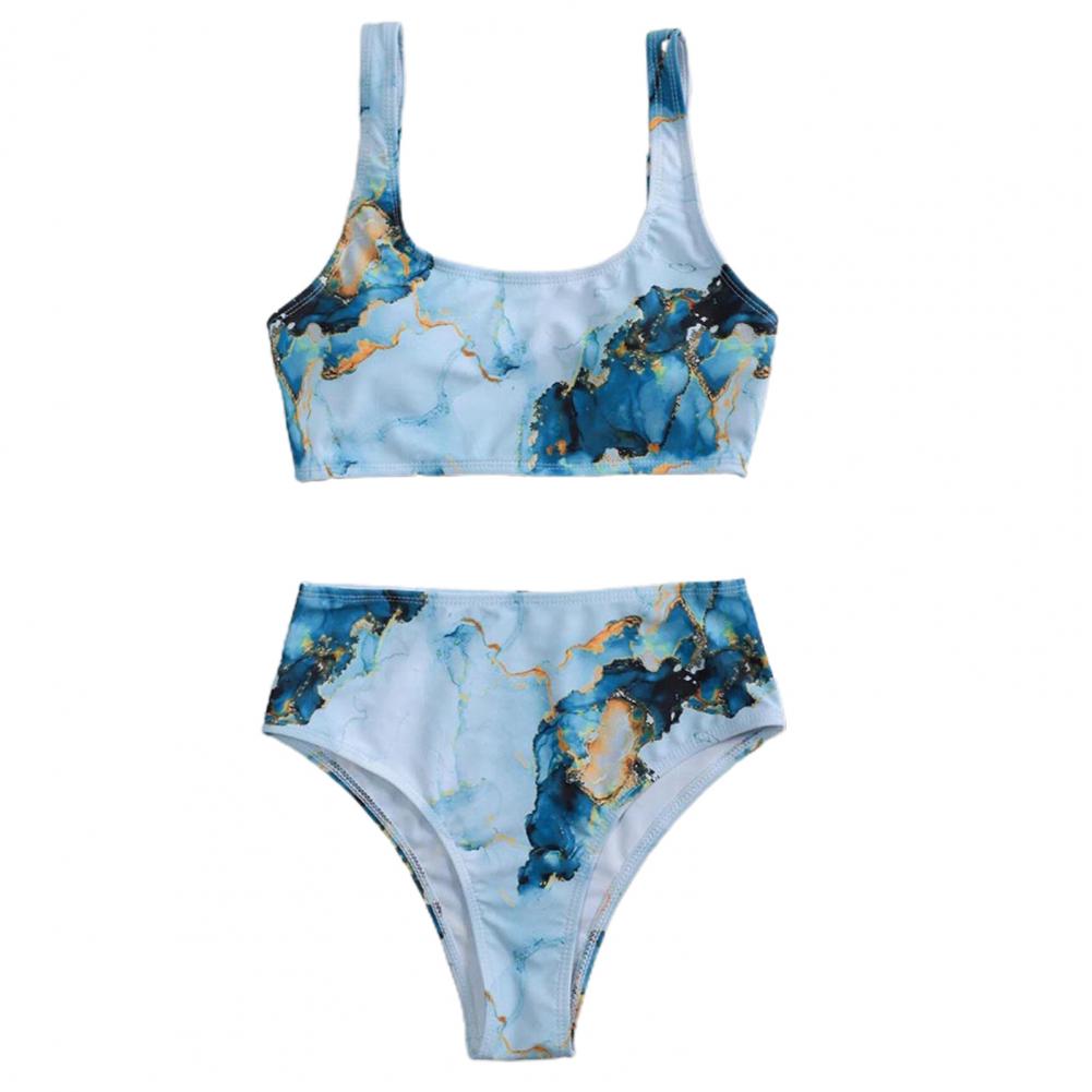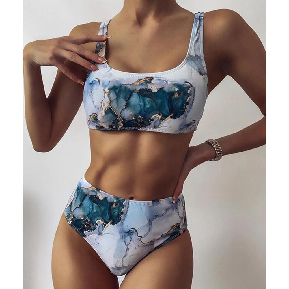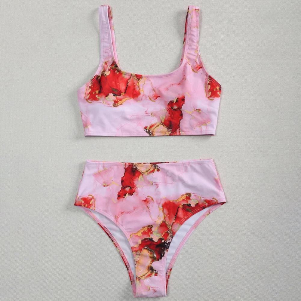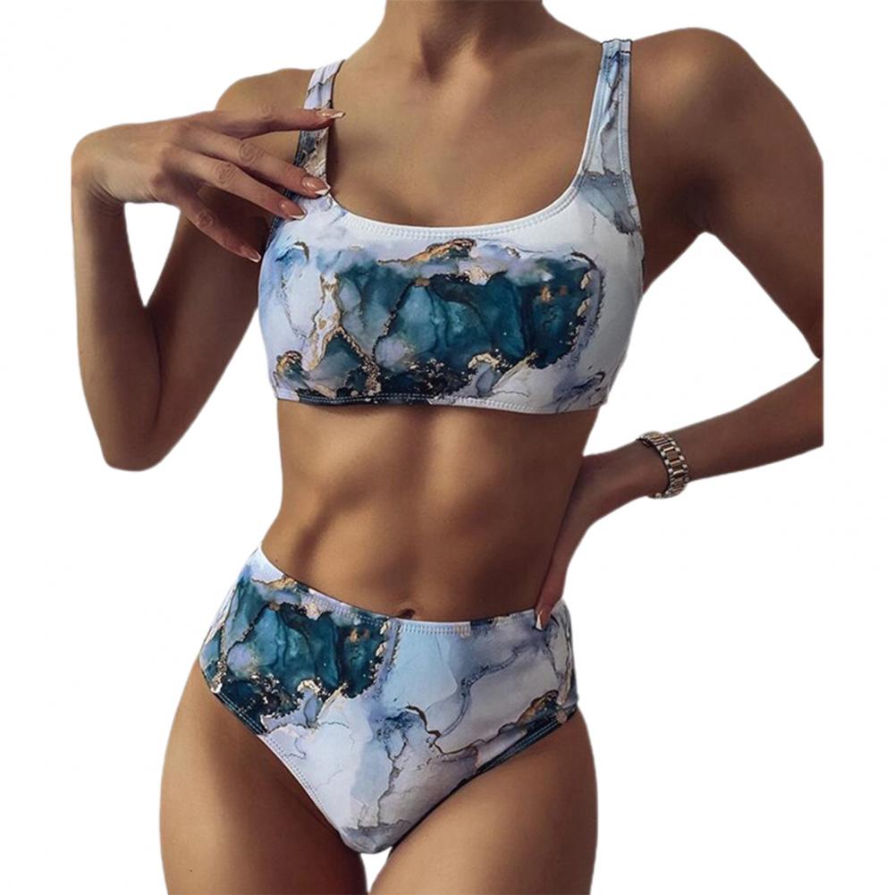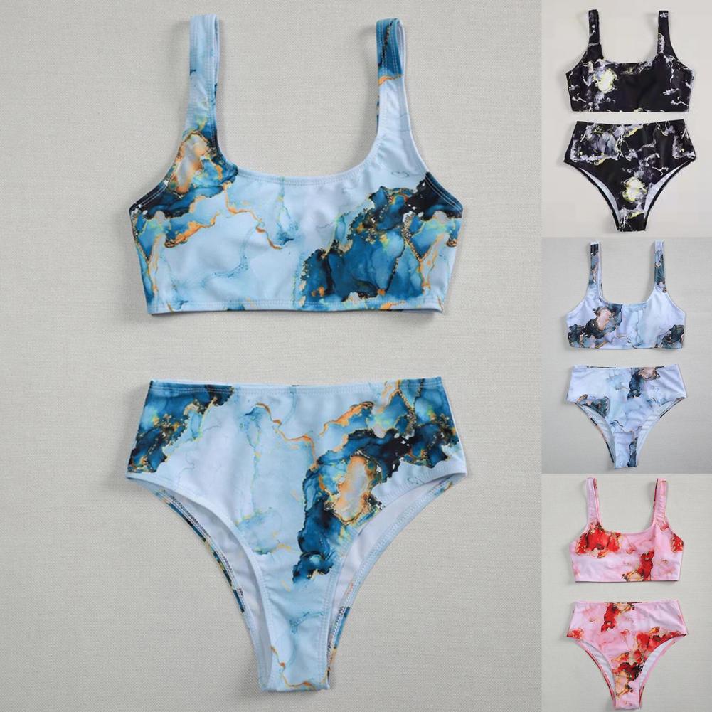 Бандо, u-образный вырез, бикини для девочек, комплект из 2 предметов, бюстгальтер с мраморным принтом, высокая талия, трусики от купальника для активного отдыха