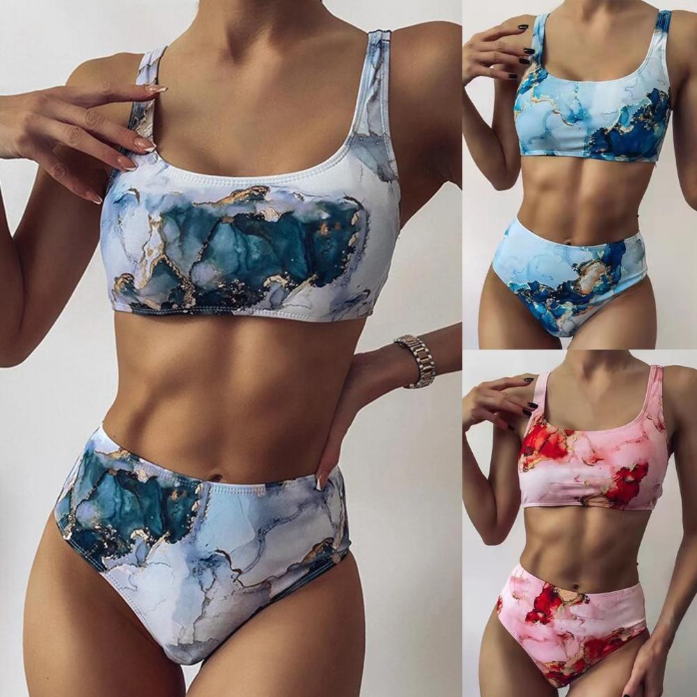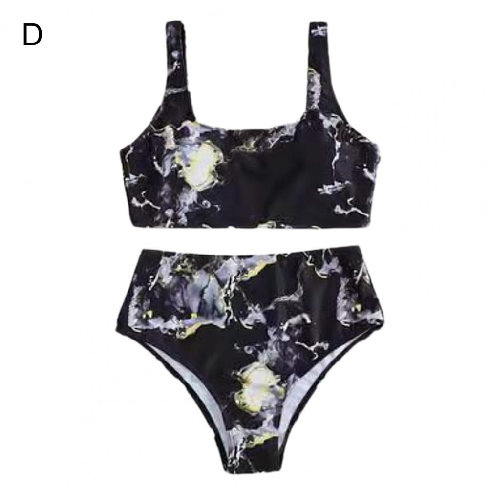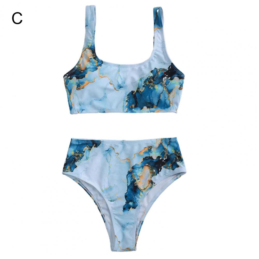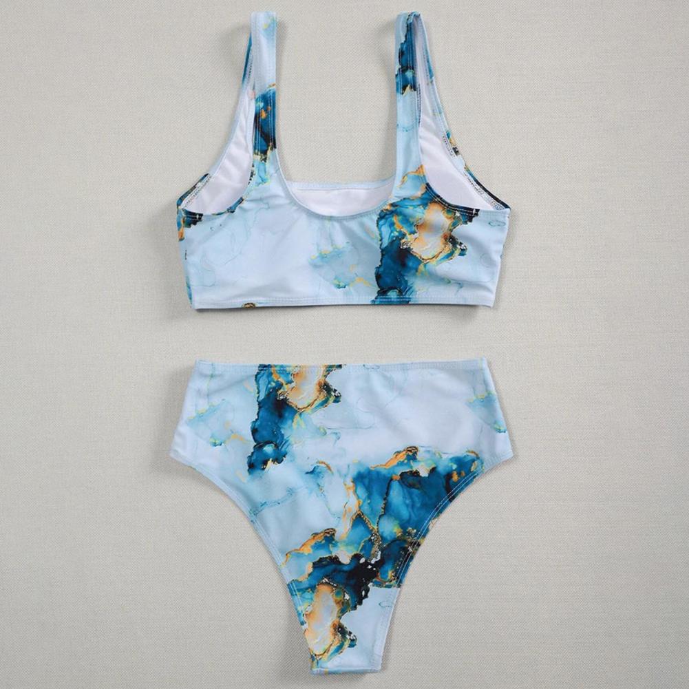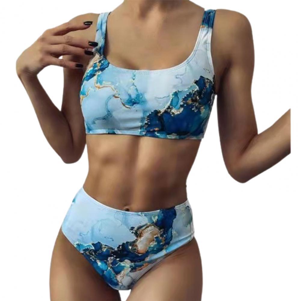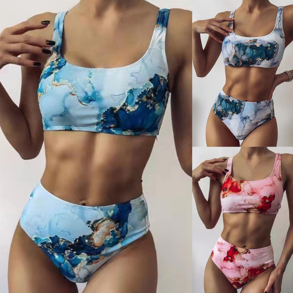 Бандо, u-образный вырез, бикини для девочек, комплект из 2 предметов, бюстгальтер с мраморным принтом, высокая талия, трусики от купальника для активного отдыха