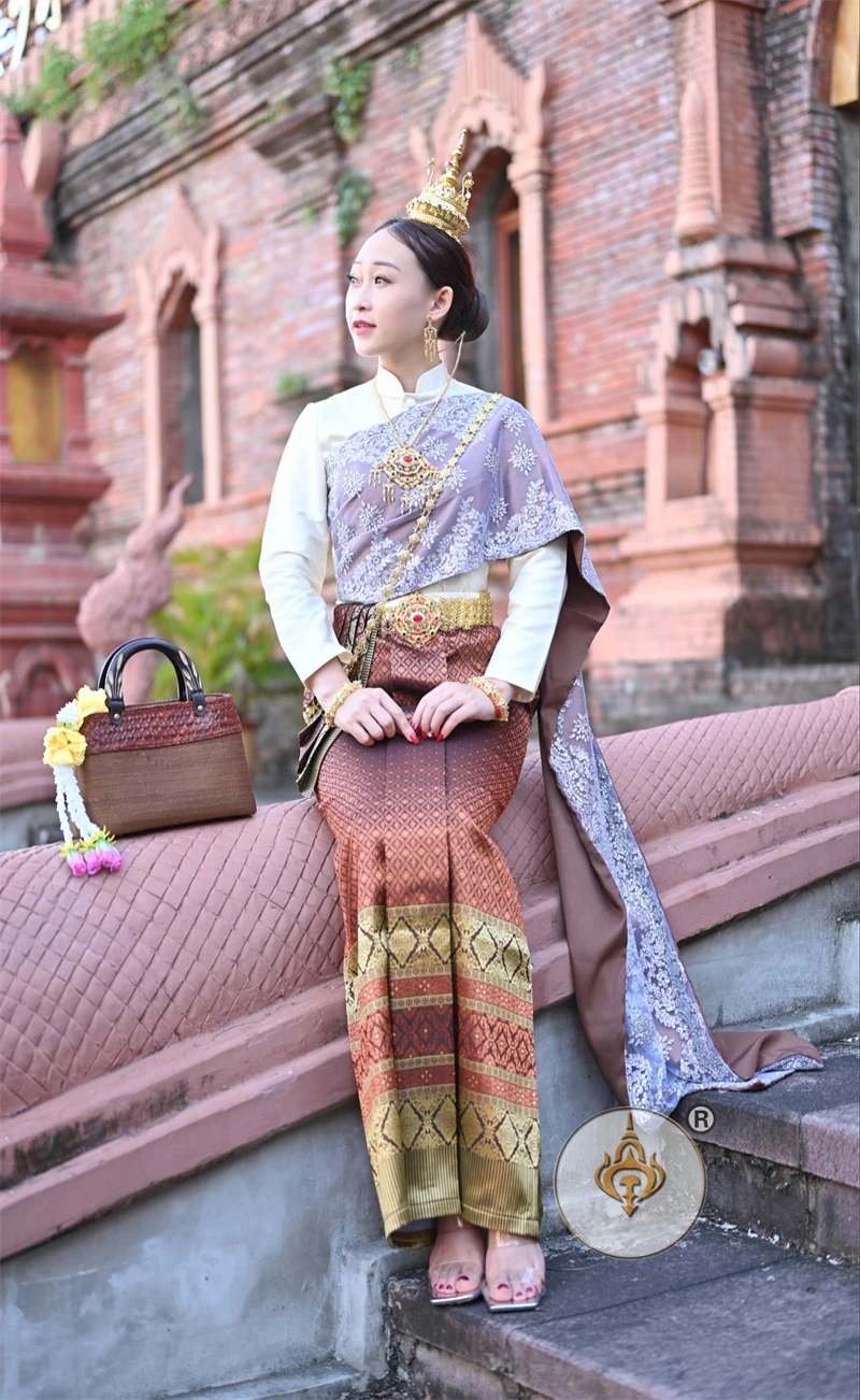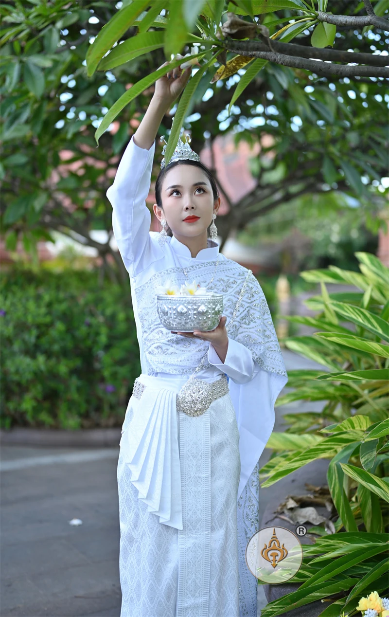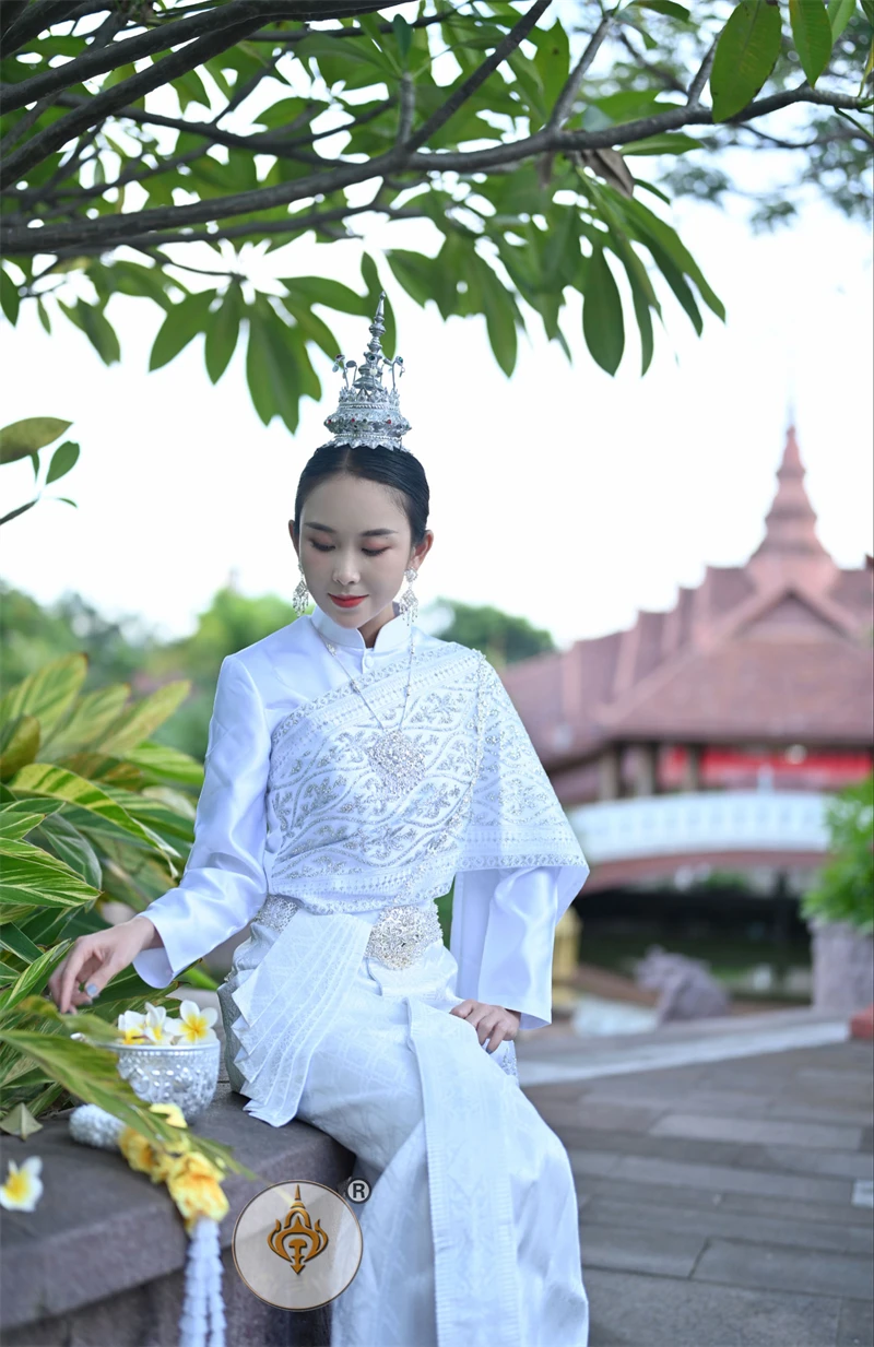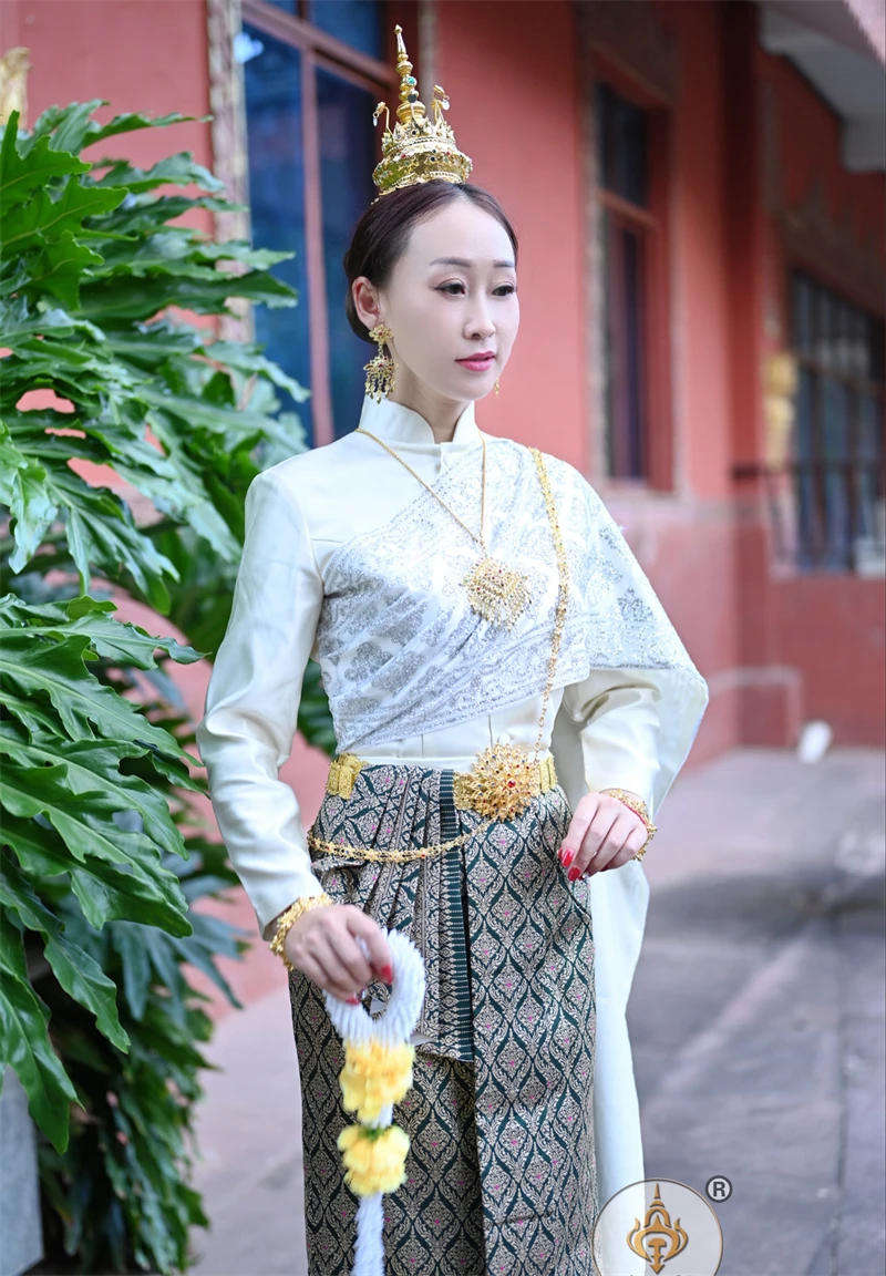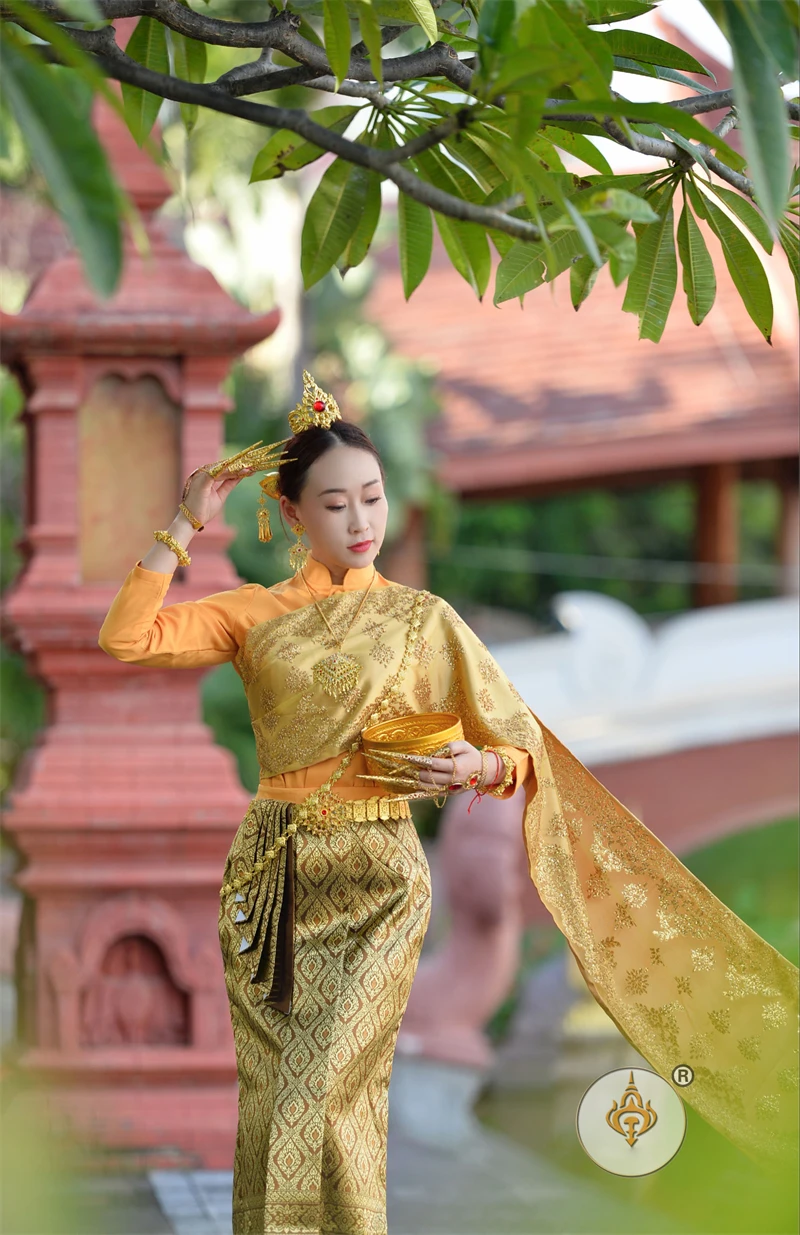 Thailand Princess Traditional Garment Women Stand Collar Long Sleeve Costume Jacket + Skirt Thai Dai Daily Welcome Work Clothes