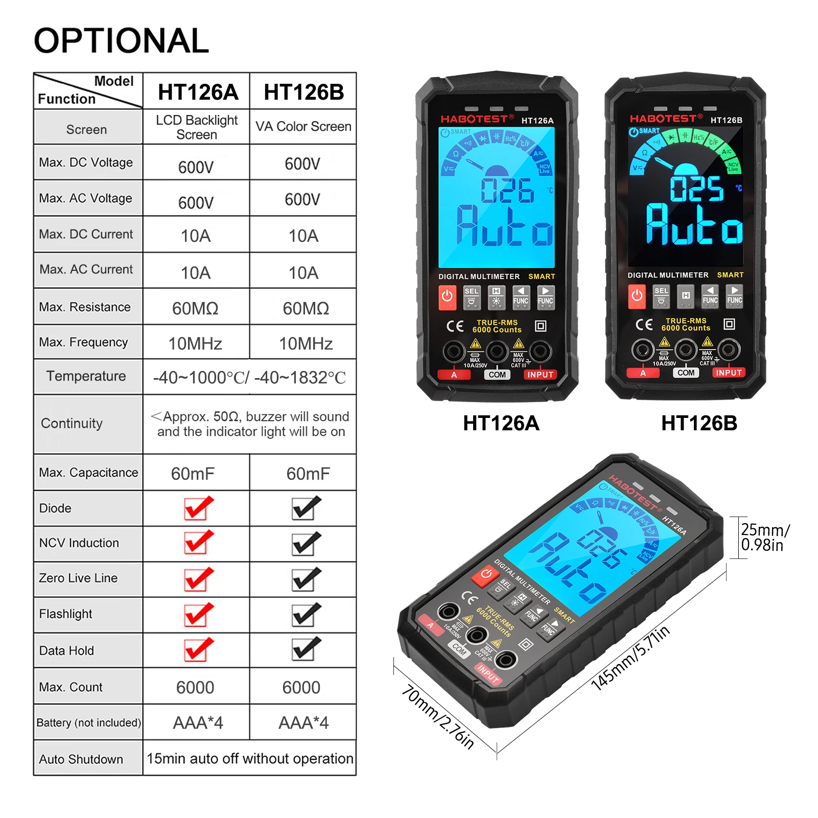 [Цифровой экран и фонарик] ЖК-экран с подсветкой (HT126A) или цветной экран VA (HT126B) значительно улучшает чтение. Фонарик для освещения измеряемого объекта, не опасаясь темных сред.