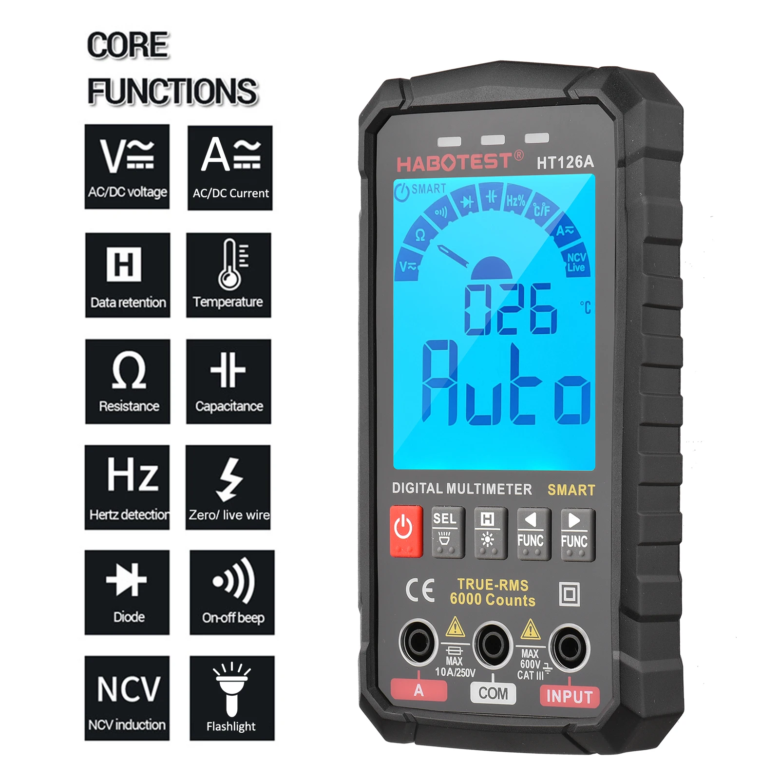 [Автоматическое/ручное ранжирование] высокая точность, широкий диапазон, истинные RMS, 6000 отсчетов, автоматическое распознавание или ручной выбор. Он может тестировать напряжение переменного/постоянного тока, переменный/постоянный ток, сопротивление, емкость, диод, частоту, непрерывность и температуру.