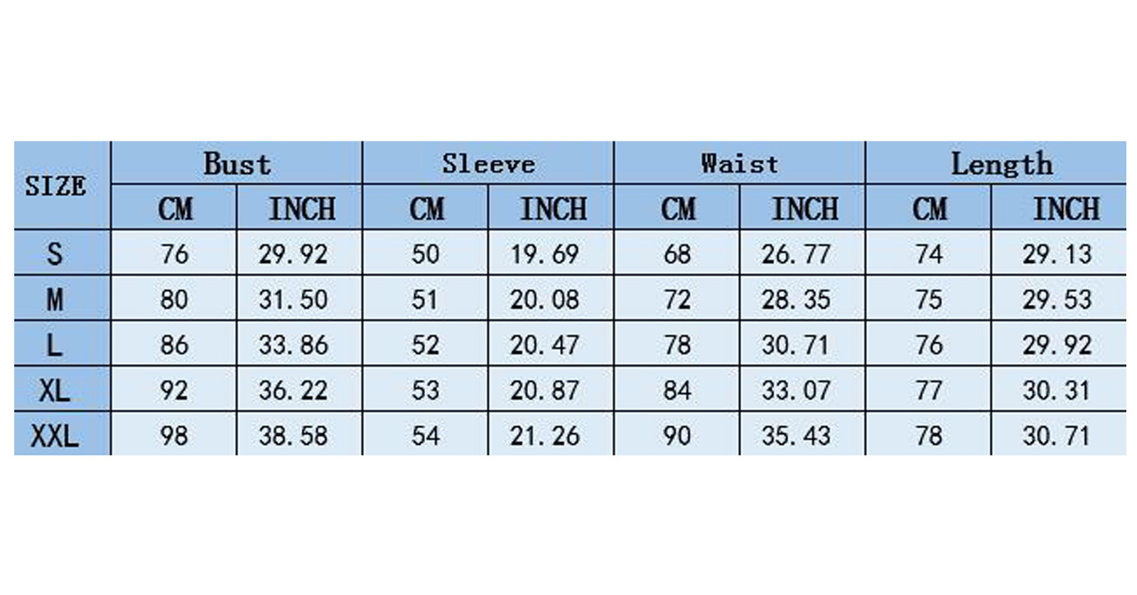 Размеры Американский размер Размер Великобритании Европейский размер Бюст Рукав Талия Длина S 2-4 6-8 32-34 76 см/29,92'' 50 см/19,69'' 68 см/26,77'' 74 см/29,13'' М 4-6 8-10 34-36 80 см/31,50'' 51 см/20,08'' 72 см/28,35'' 75 см/29,53'' L 6-8 10-12 36-38 86 см/33,86'' 52 см/20,47'' 78 см/30,71'' 76 см/29,92'' XL 8-10 12-14 38-40 92 см/36,22'' 53 см/20,87'' 84 см/33,07'' 77 см/30,31'' XXL 10-12 14-16 40-42 98 см/38,58'' 54 см/21,26'' 90 см/35,43'' 78 см/30,71''Выбрал данную спортивную сумку для похода в спортзал, потому что моя старая порвалась. Пришла посылка мне через месяц, может быть... Читать отзыв полностью...