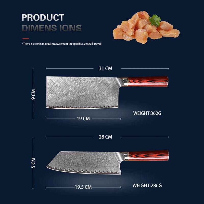Острые из 67 слоев дамасской стали кованые, высокая твердость и высокая кромка. 33 слоя базовой стали используются с обеих сторон для стабилизации твердости около 60