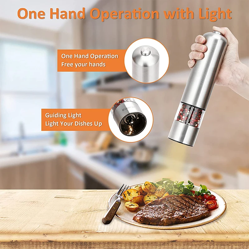 【All-Fitted Modern Design】This electric salt and pepper grinder set has a very simple but all-fitted design, it’s a very good decoration for your dinner table, BBQ, kitchen when it’s not been used. And the bottom built-in warm light can not only light your food up, but also can spice your feeling when using it.