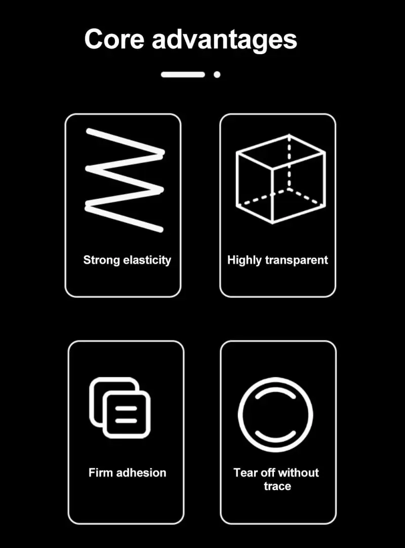 Характеристики: 1. Прочная и высокая вязкость, 2. Прозрачная и немаркированная, 3. Моющаяся и многоразовая, 4. Легко снимается