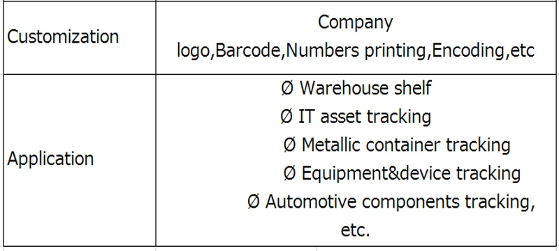 Бирка является гибкой и может быть застревает на металлических активах легко, особенно для неправильной и неровной поверхности, таких как стальной котел, металлический контейнер, стальные трубы и т. Д. Он имеет хорошую производительность на металле и может быть напечатан, логотип, цифры, textby RFID принтеров.