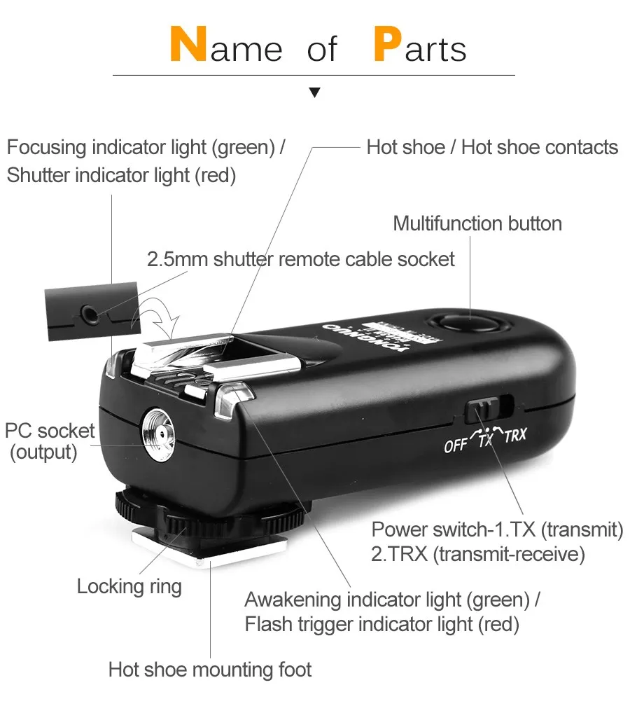 Комплектация: (батарейки в комплект не входят)Передатчик-1 шт.1 x Приемник1x2,5 мм порт пульт дистанционного управления с кабелем для спуска затвора1 руководство на английском и китайском языках