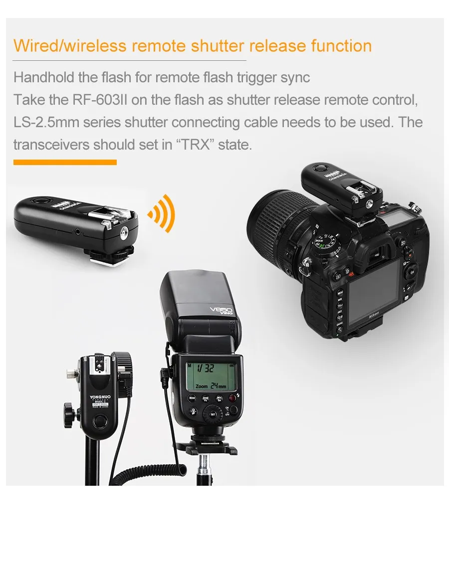 YONGNUO RF-603 II триггер вспышки 2 трансивера набор спуска затвора для Nikon RF-603 II N1 N3 RF-603 II, ручная вспышка триггера и спуск затвора (вы можете использовать эти две функции одновременности), он принимает Глобальный Бесплатная доставка по всему миру FSK 2,4 ГГц беспроводной канал, который может быть пригоден во многих странах. RF-603 II с системой FSK, может быть более эффективным, чтобы гарантировать скорость, расстояние и стабильность. В емких областях расстояние дистанционного управления может достигать 100 м и подходит для первого поколения RF-603.Suit первого поколения, вы можете использовать их вместе.Примечание: Canon camera s choose RF-603 II версия Canon, Nikon Camera Chose RF-603 II версия Nikon, другие камеры s могут выбрать любую версиюRF-603 II C1 триггер вспышки для Canon Rebel 300D/350D/400D/450D/500D/550D/1000D серииRF-603 II C3 триггер вспышки для Canon 10D/20D/30D/40D/50D/1D/1D Mark II/1D Mark III/1D Mark IV/ 1Ds / 1Ds Mark II /1Ds Mark III /5D/ 5D Mark II/5D Mark III /1DX/ 6D/7DБолее высокая скорость синхронизации, чем первое поколение --- самая высокая скорость синхронизации вспышки до 1/320 секунды (некоторые модели могут достигать только 1/250 с или меньше, разница в сочетании моделей вспышки и использования камеры может достичь разницы в скорости синхронизации).Добавление фиксирующих колецУлучшенные кнопки управления вспышкой/затворомРаботает для большего количества камер Canon/Nikon s и одиночной контактной камеры s --- все стандартные DSLR камеры горячего башмака, кроме Sony и Minolta.Добавление выключателя питания для одного передатчика --- установите переключатель питания на TX (одиночная передача) или TRX (автоматический переключатель передачи) в соответствии с различными требованиями к съемке. Когда он используется в качестве беспроводного передатчика запуска и тестирования вспышки, установите в «TX»; Когда он используется в качестве беспроводного приемника запуска, с помощью спуска затвора или других расширенных функций, установите в «TRX». Включение в выключение означает выключение питания.RF-603 II N1 триггер вспышки для D800/D700/D300/D2X/D2H/D200/D1H/D1X/D3X/D3RF-603 II N3 триггер вспышки для Nikon D7000 D5100 D5000 D3100 D90 D600RF-603II принимает Глобальный Бесплатная доставка по всему миру FSK 2,4 ГГц беспроводной канал, который может быть пригоден во многих странах.Расстояние дистанционного управления может достигать 100 м и подходит для RF-603I.Этот беспроводной комплект триггера вспышки состоит из двух одинаковых трансиверов. Он может быть установлен в одно состояние передачи (TX), что будет более удобным для тестирования вспышки, и может быть установлен в состояние трансивера (TRX), автоматически переключается передача и получение состояния, принимает 2 кнопки рычага, он воплотит в жизнь пробуждение, тестирование вспышки, фокусировку и функцию затвора в «TX» И "TRX" Состояние соответственно.Передатчик поддерживает запуск с одним контактом, поддерживает беспроводное включение и запуск вспышки через? Горячий башмак для камеры, со специальным кабелем для подключения затвора камеры, может реализовывать проводной/беспроводной пульт дистанционного управления спуском затвора, Поддерживает одновременное управление несколькими камерами и вспышками.Максимальная скорость синхронизации вспышки до 1/320 секунд (некоторые модели могут достигать только 1/250 с или меньше, разница в сочетании моделей вспышки и использования камеры может достичь разницы в скорости синхронизации вспышки.)