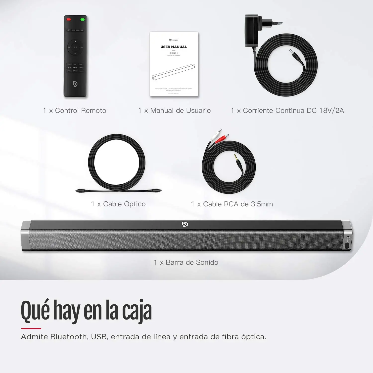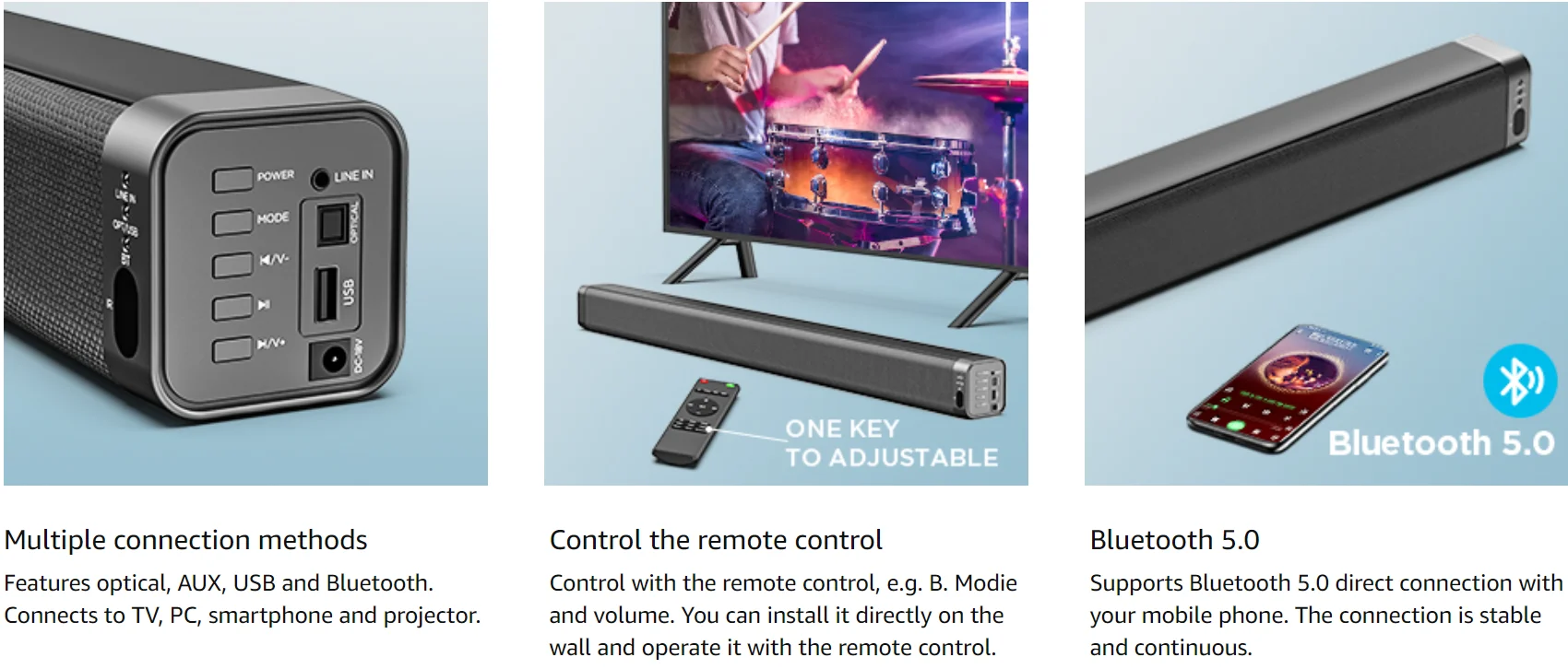 Звук: этот саундбар мощностью 80 Вт имеет 4 встроенных полнодиапазонных динамика. Если ваша комната не очень большая, достаточно 80 Вт. Не беспокойтесь о беспокоящих соседях, если звук слишком громкий. Оптическое Соединение: вы можете подключить Саундбар к телевизору с помощью оптического подключения. (Обратите внимание: на оптическом кабеле имеется защитная пленка, которую необходимо снять). Беспроводное изменение: этот саундбар имеет функцию Bluetooth. Вы можете подключить саундбар на свой мобильный телефон по беспроводной связи через Bluetooth. Без проводов.