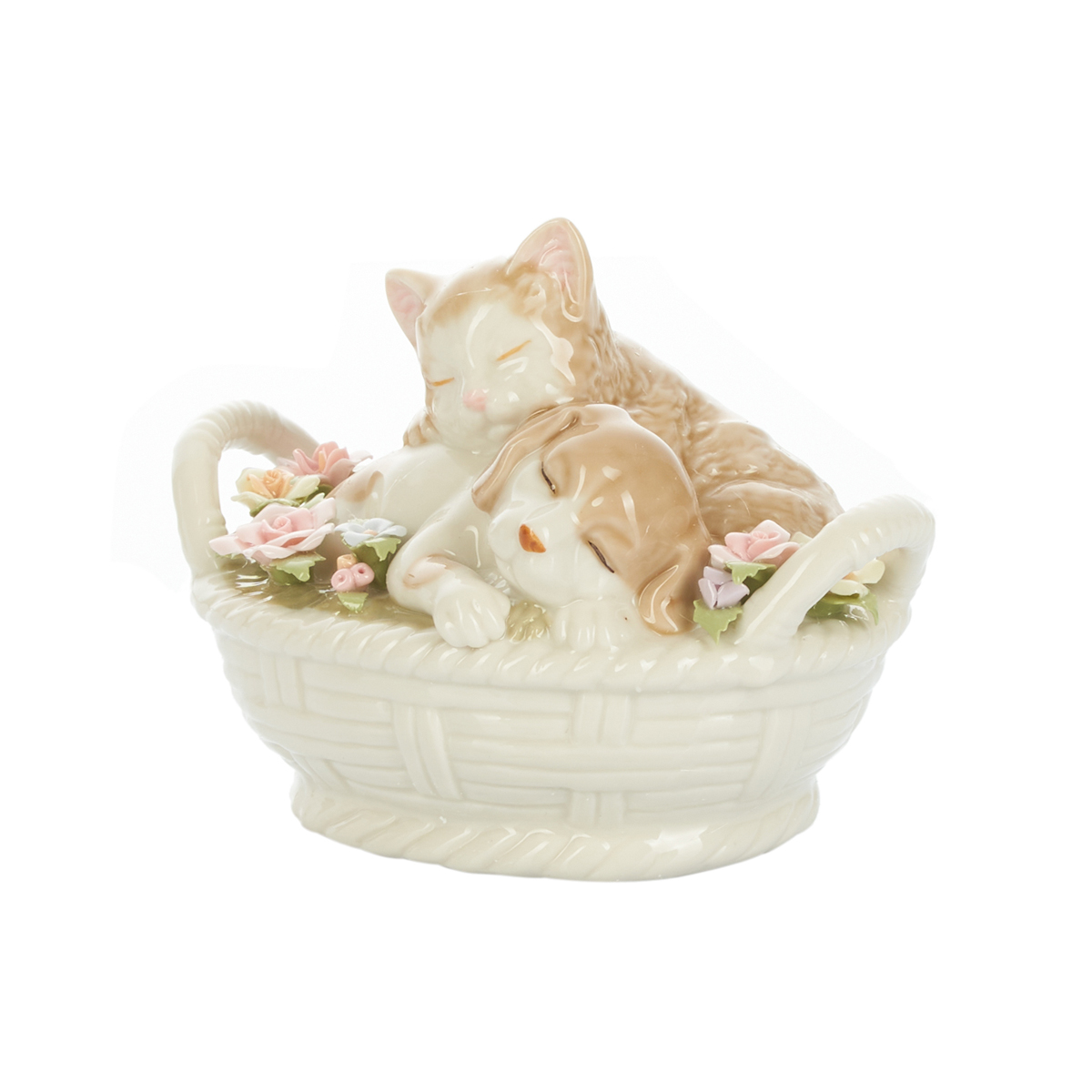 Statuette musical Gipfel cat and dog 41517 in the form of a cute kitten and a puppy sleeping in a basket. Size figurines 14 x9x10cm. There is a key at the bottom of the basket that turns on the music. The figurine is made of porcelain. The statuette will become a bright highlight of any interior, will create a pleasant cozy atmosphere at home.
